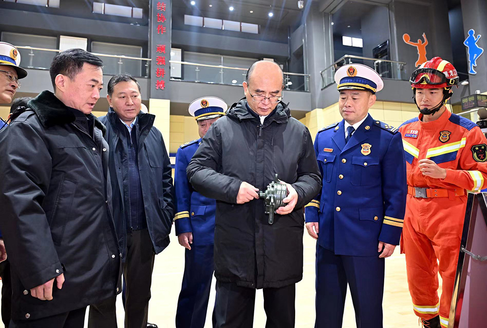 허근은 성소방구조총대에서 소방응급지휘, 소방대오건설 등 상황을 료해하고 소방구조대오의 실전연습을 영상으로 참관했다.