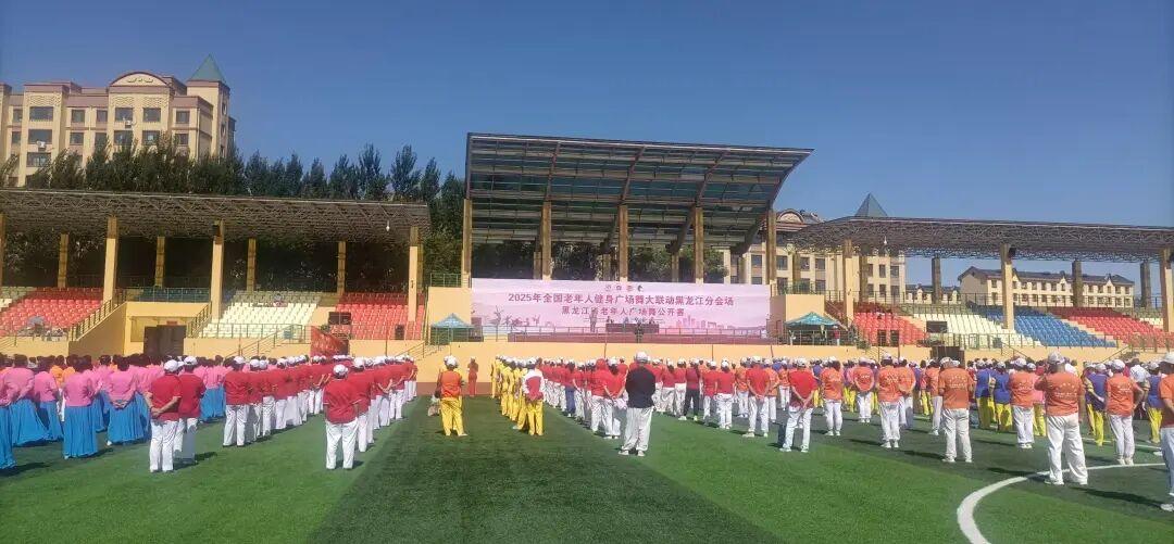 2025년 전국로년건강광장무련합공연 흑룡강 분회장 공연은 목릉시올림픽체육장에서 열렸다.