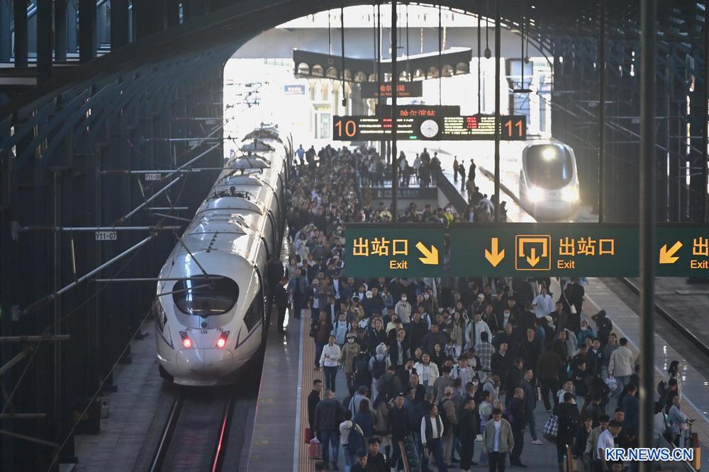 이날 흑룡강성 할빈역에서 렬차에 탑승하는 승객들.