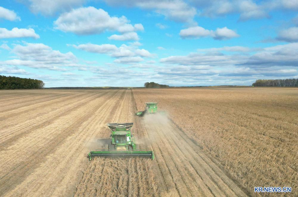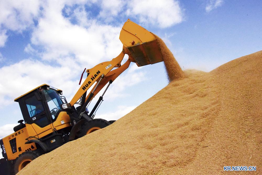 8일 북대황그룹 흑룡강 수분농장회사 동정관리구의 곡물 건조장에서 한 작업자가 기계로 수확한 벼를 쌓고 있다. 절기상 한로를 맞아 흑룡강성 들녘 곳곳에서 분주한 풍경이 연출됐다.