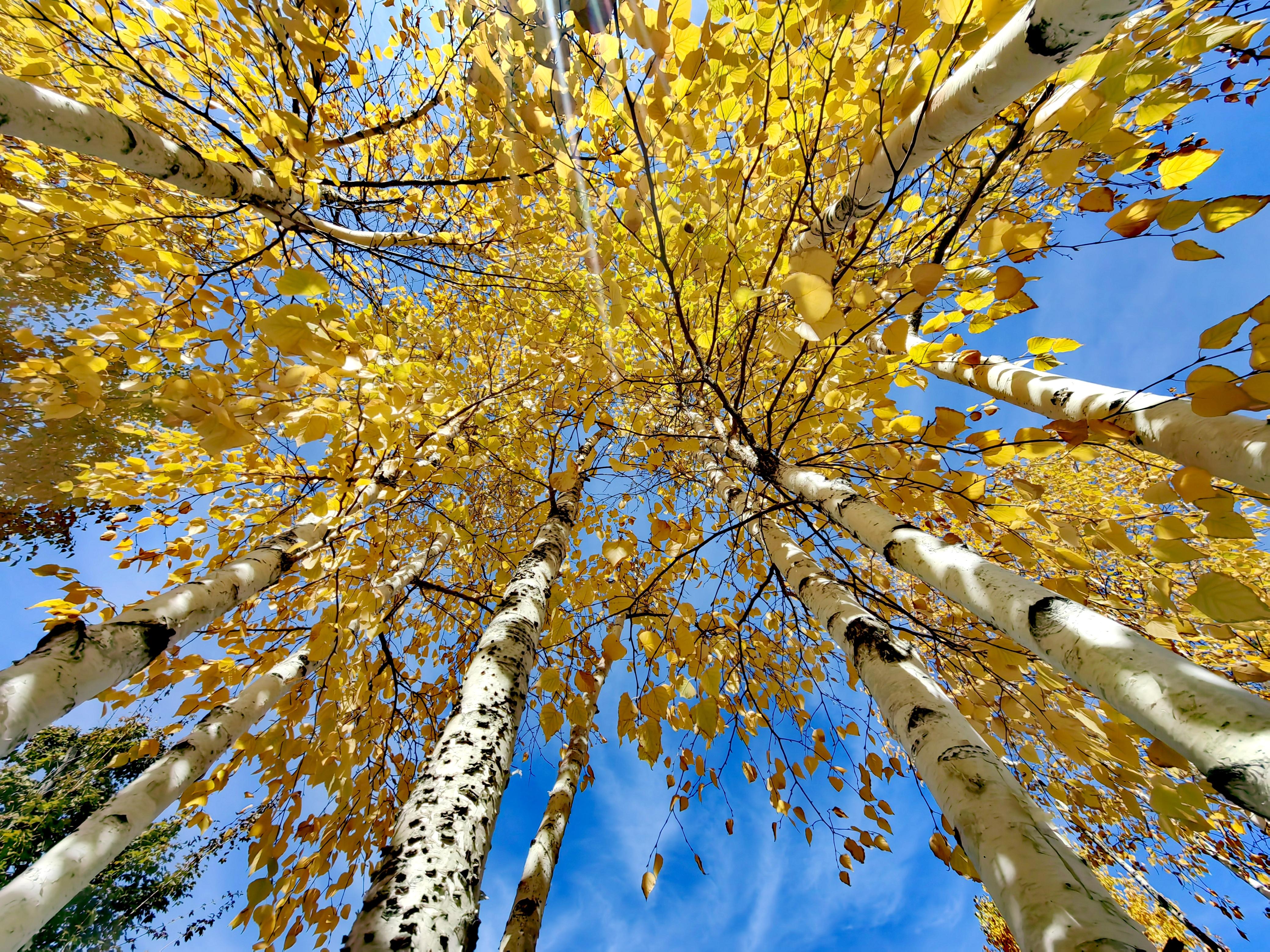 깊은 가을의 자작나무는 곧은 줄기가 하늘로 높이 뻗어있고 나무껍질은 종이처럼 하얗다. 나무끝에 달린 잎들은 이미 초록색에서 황금색으로 변했으며 해살 아래에서 짙은 색조와 매혹적인 경치를 뽐내고 있다.