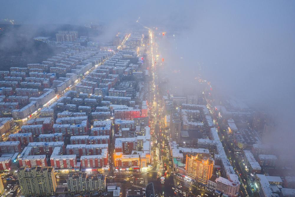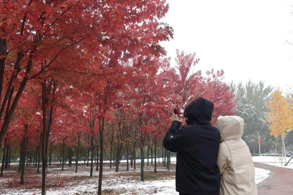 15일 흑룡강성 수화시 시민이 눈 쌓인 거리 풍경을 휴대전화 사진에 담고 있다. 이날 흑룡강성 곳곳에 눈이 내렸다.