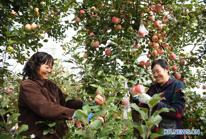 섬서성 연안시 보탑구 연동구촌 농민이 사과를 수확하고 있다. (사진/신화통신)