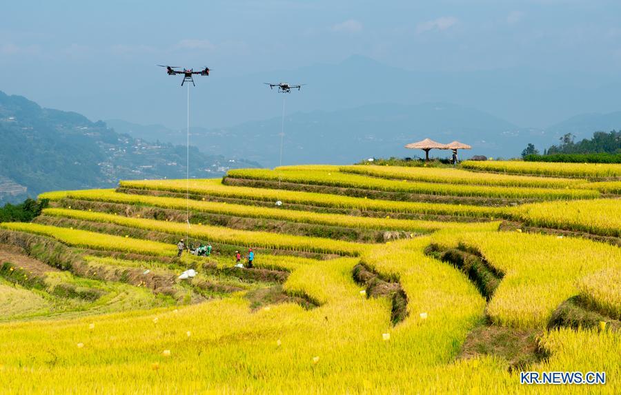 호북성 이창시 자귀현 주민들이 드론을 리용해 수확한 벼를 운반하는 모습. (사진/신화통신)