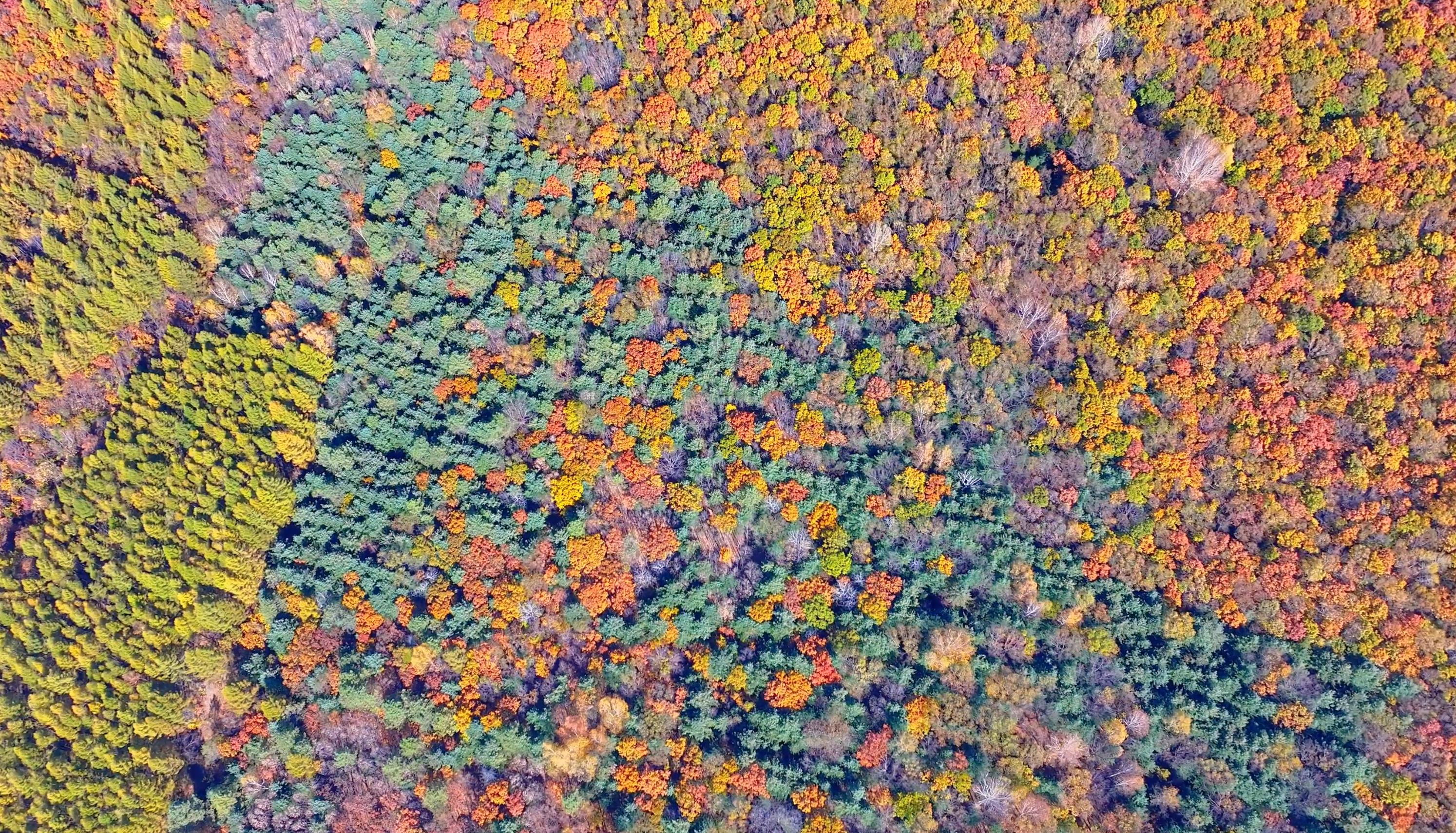 가까이에 있는 숲은 마치 가을 해살이 물감을 듬뿍 묻혀 노란색, 주황색, 진한 갈색과 짙은 초록색을 엮어 놓은 것 같으며 각각의 나무는 고유한 색채를 이루면서도 조화롭게 하나같은 비단이 된다.