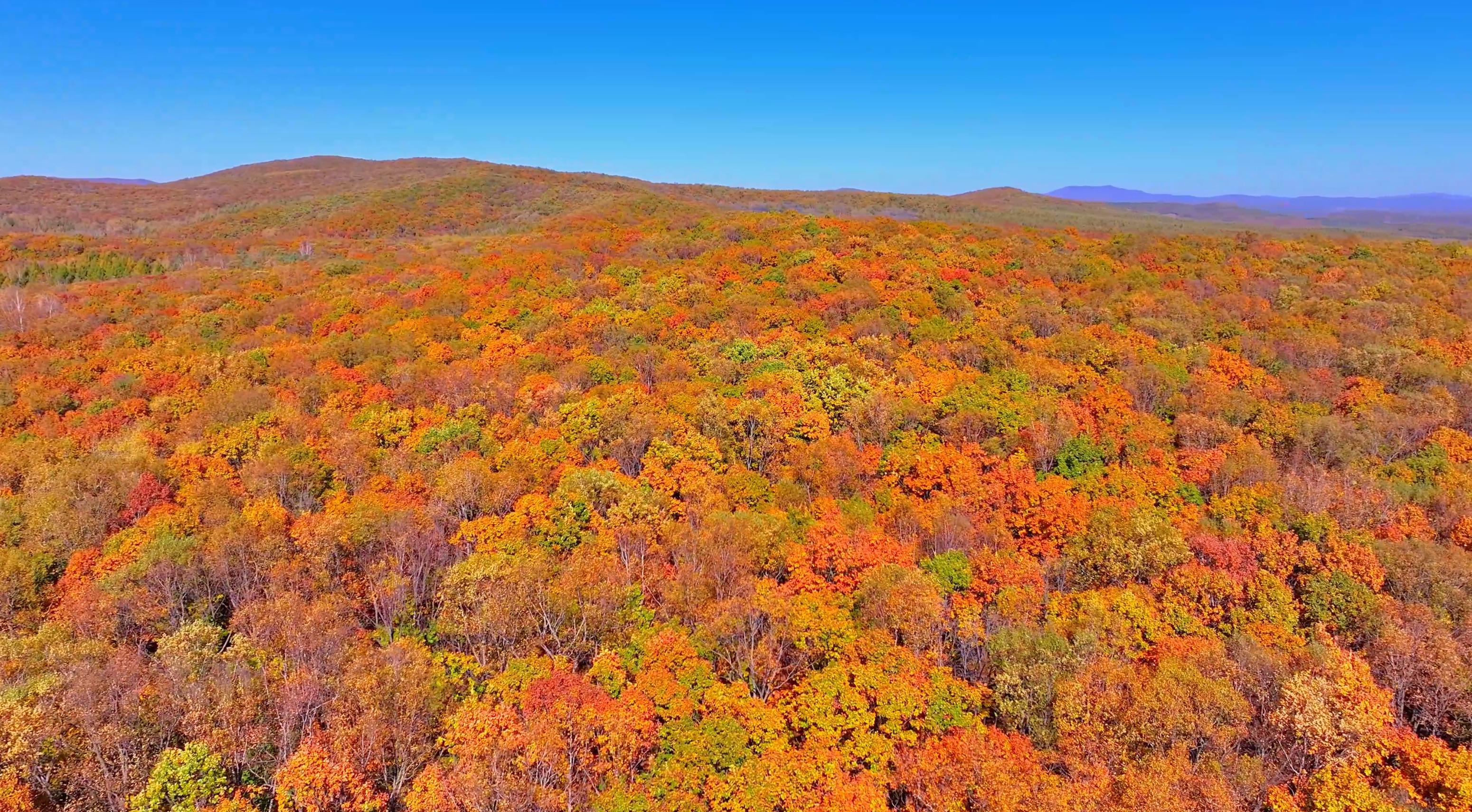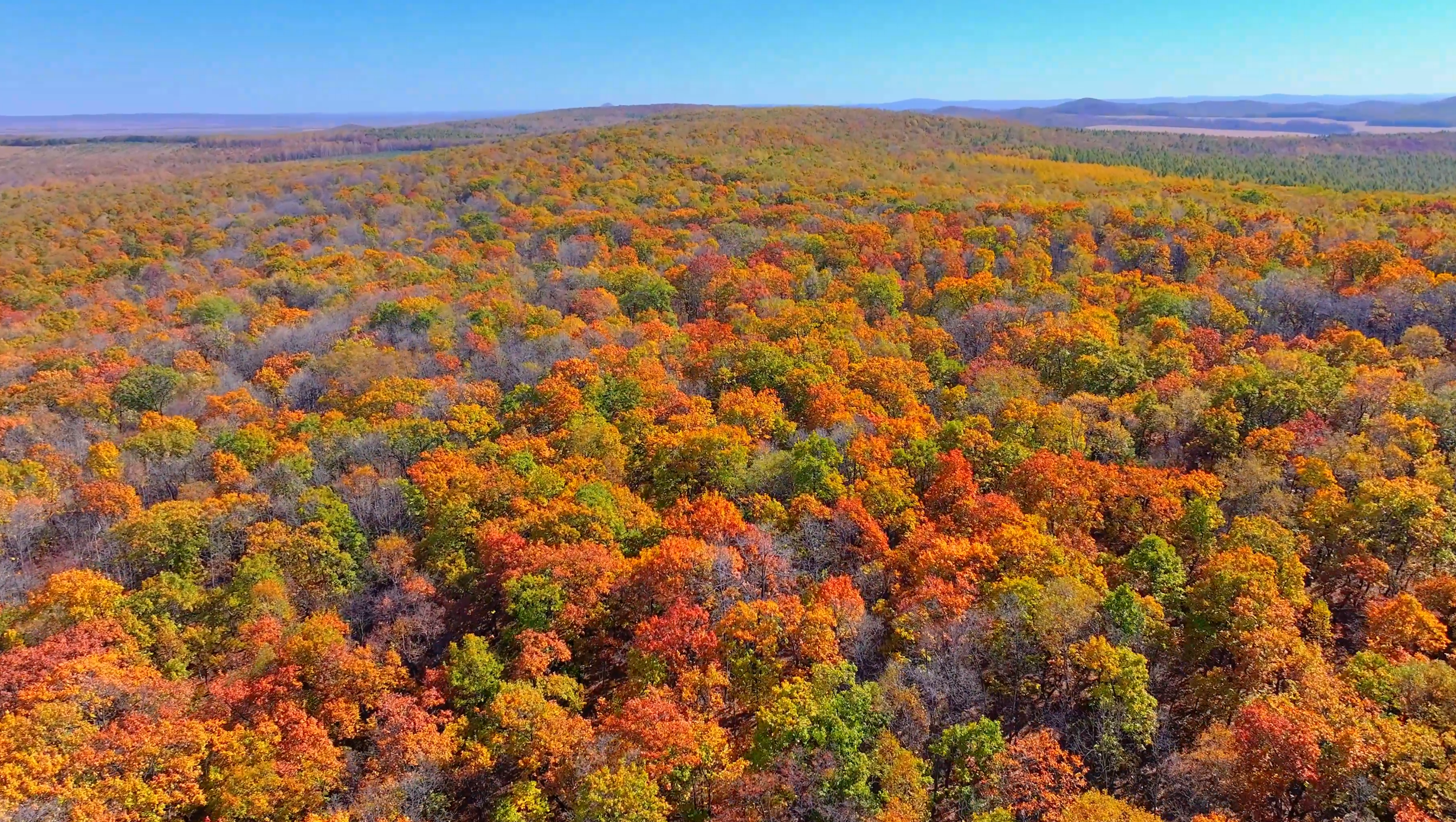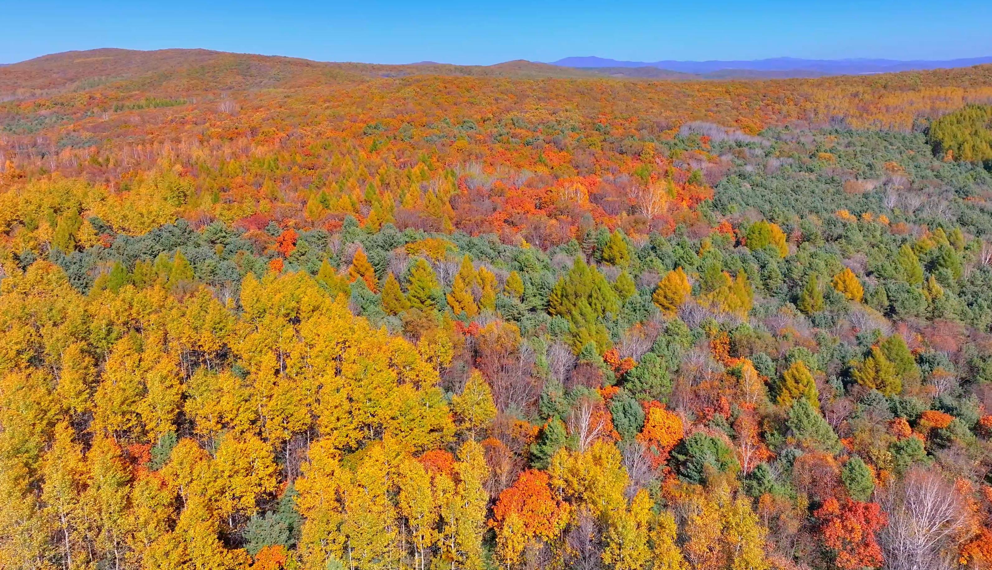 멀리 바라보면 산들이 겹겹이 쌓여 있으며 연두색 수림과 오색단풍 숲의 경계는 마치 대자연이 점층적인 색채로 번지게 한 것 같아 하늘 수평선과 연보라색의 먼산이 하나가 된다.