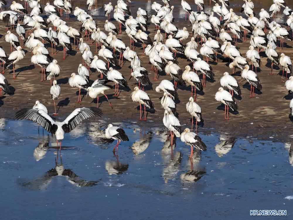 22일 흑룡강성 송화강 습지에 무리를 지어 몰려있는 황새.