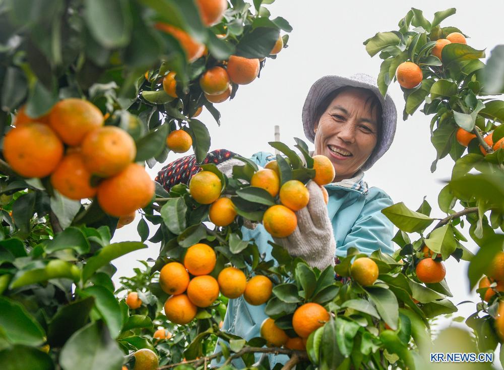 2일 호남성 영주시 도현에서 한 농민이 귤을 수확하고 있다.