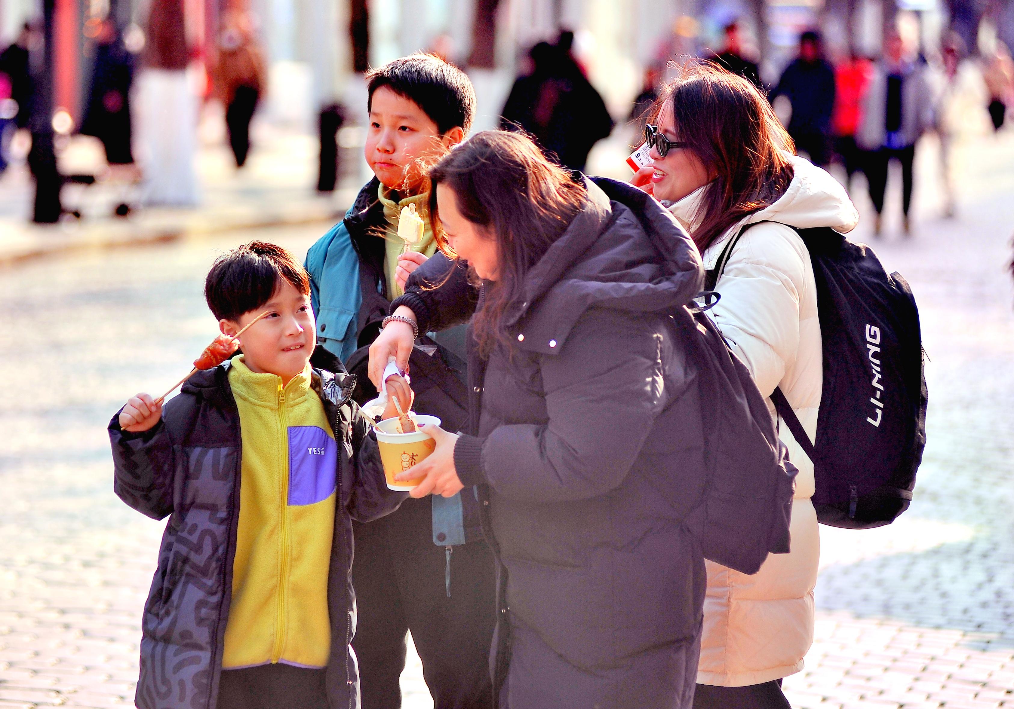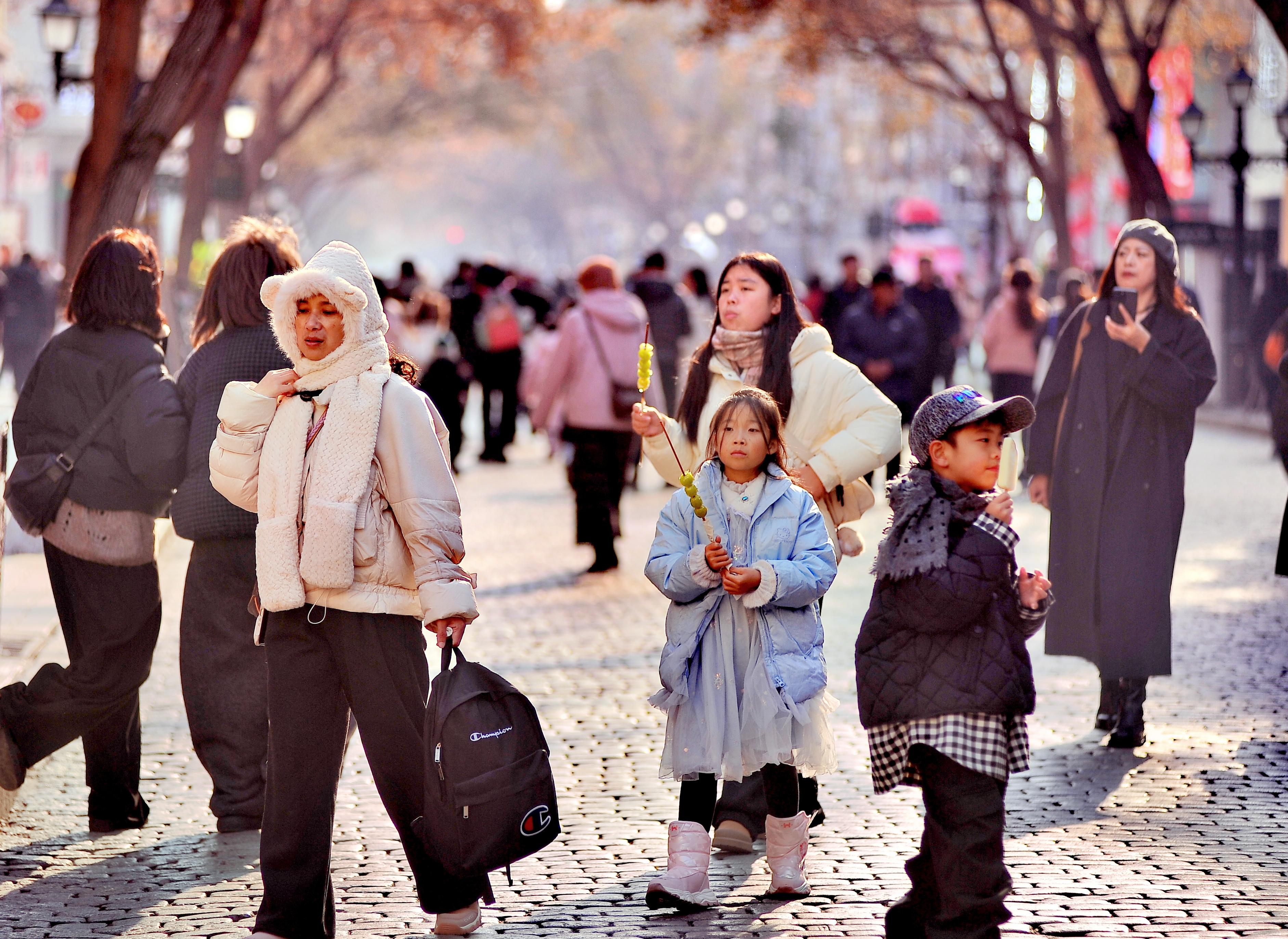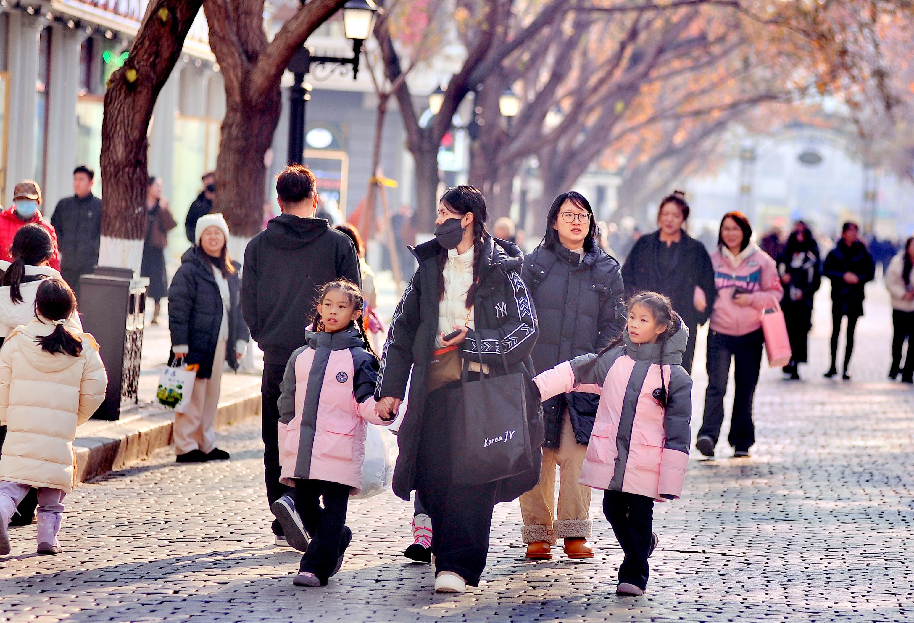 12일, 할빈시 도리구 중앙대가와 송화강가에서 많은 남방어린이들이 부모 따라 관광하며 맛있는 음식을 즐기고 있었다.