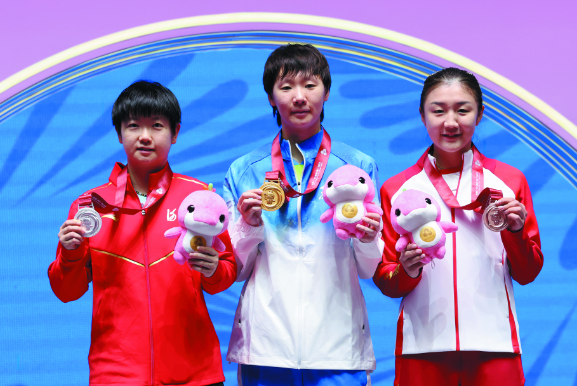 16일, 제15회 전국운동회 탁구 녀자단식 우승을 따낸 왕만욱(중간)이 2위 손영사(좌), 3위 진몽과 기념사진을 남기고 있다.