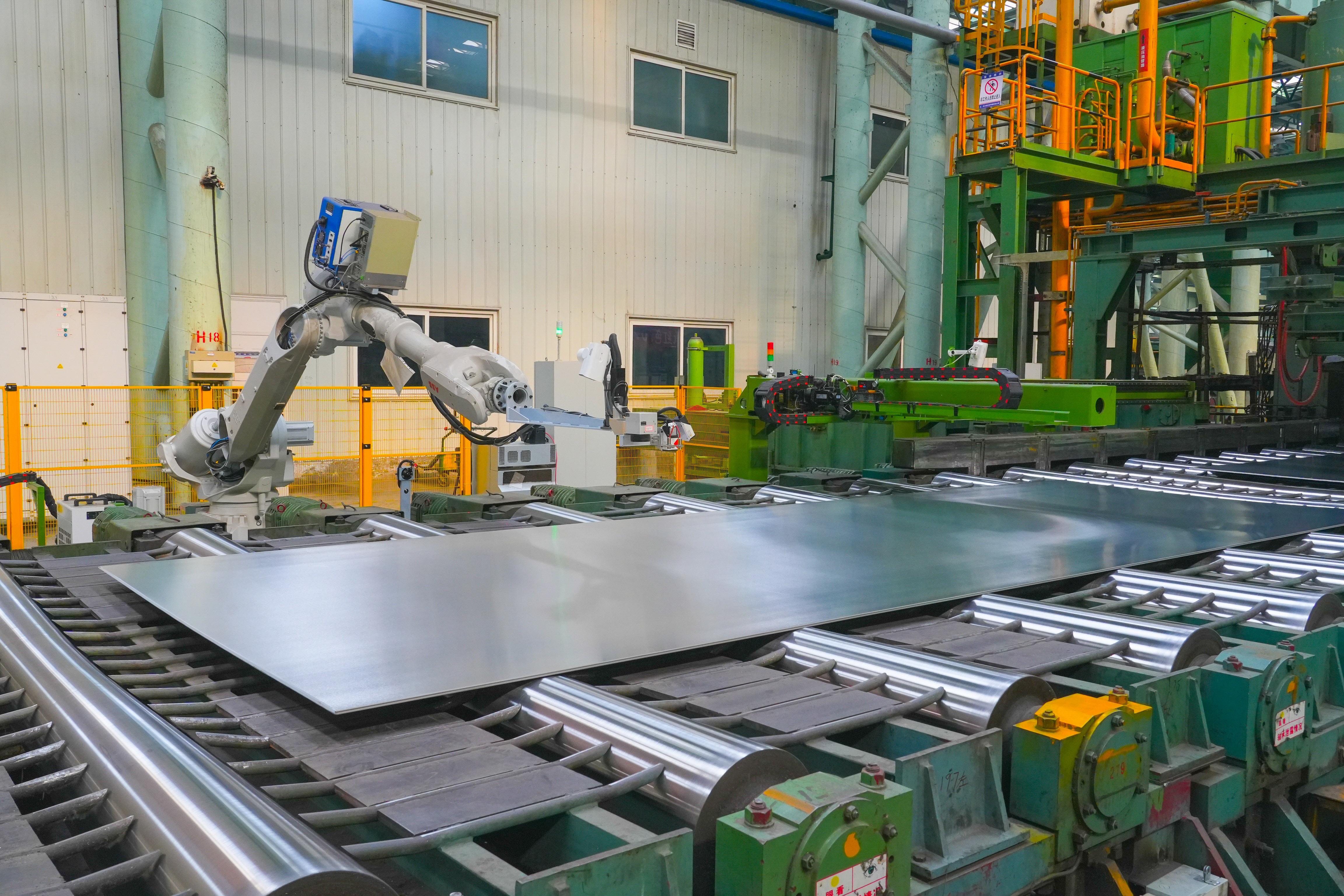 동북경합금유한책임회사 중후판 공장 AGV 운반차가 판재를 운반하고 있다.