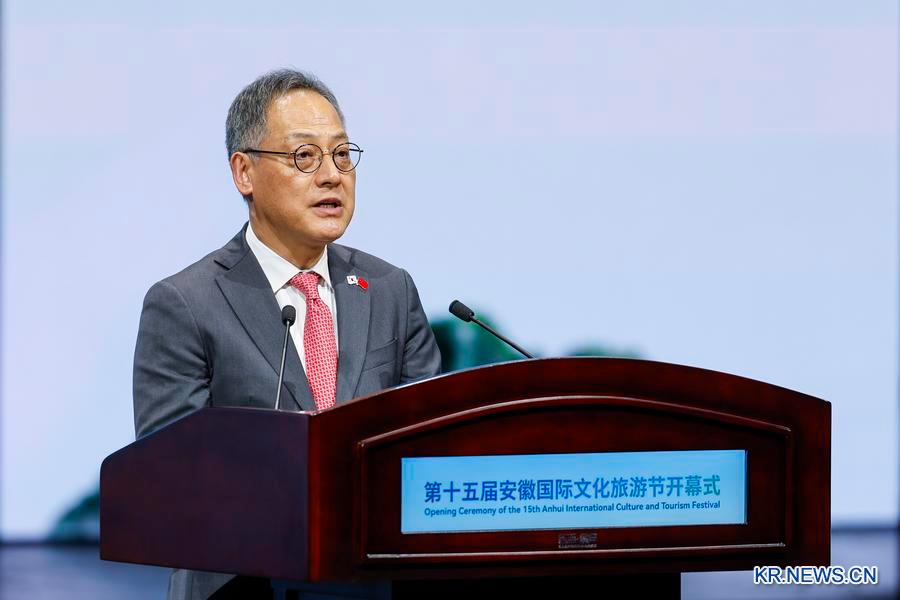 지난 15일 김영준 주상해 한국총령사가 '제15회 안휘국제문화관광페스티벌' 개막식에서 축사를 전하고 있다. (사진/신화통신)