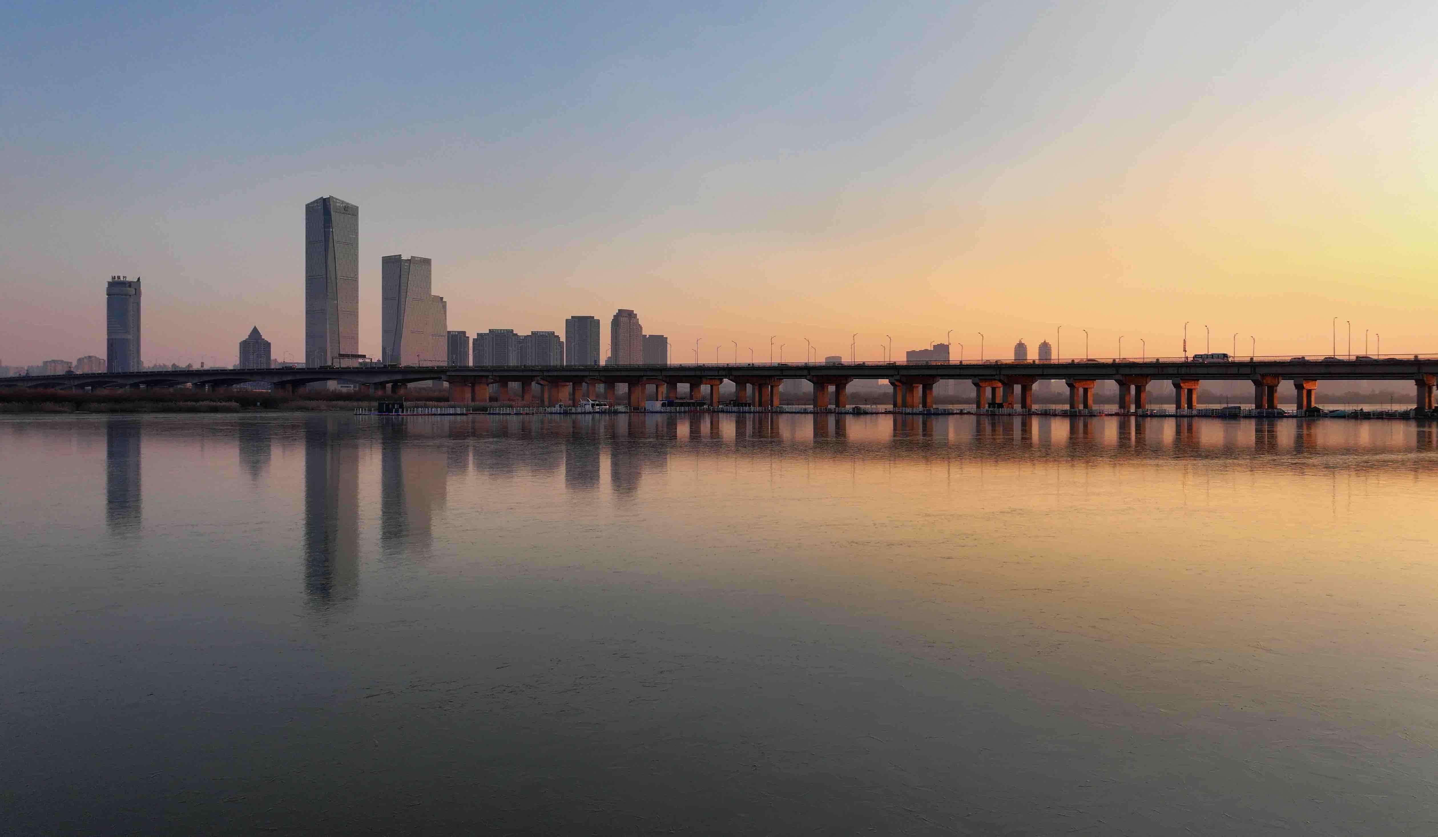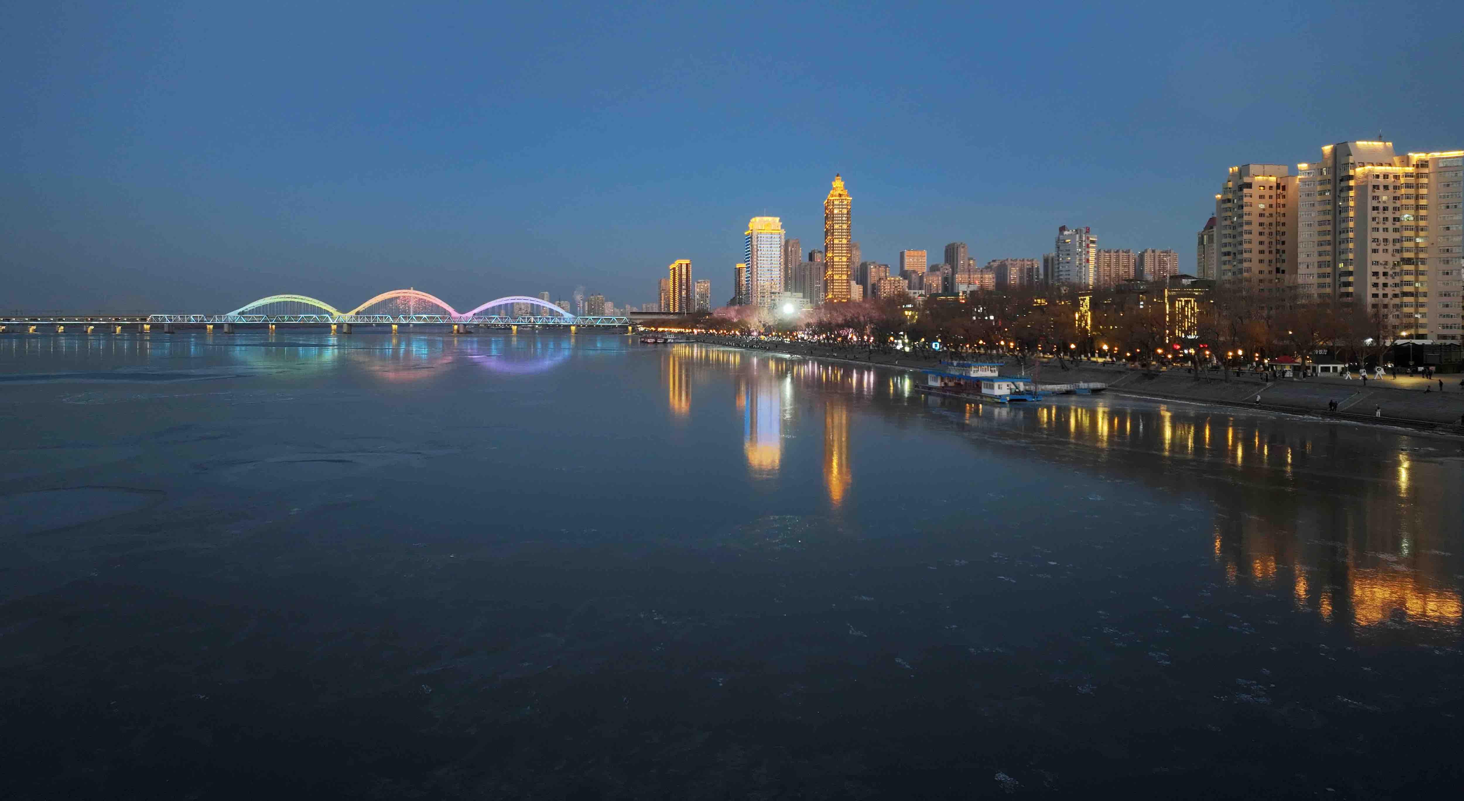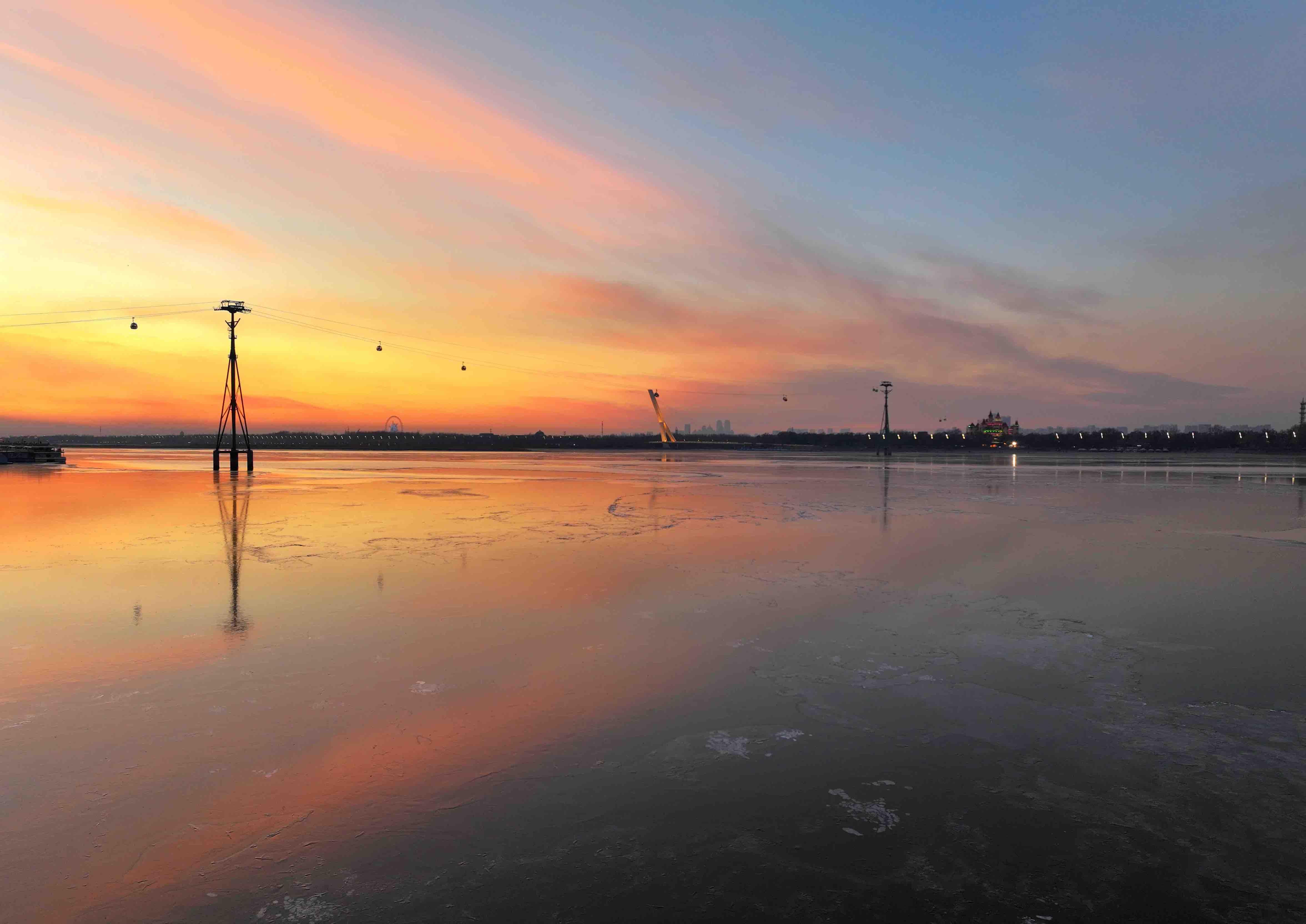 최근 송화강 할빈 시내 구간이 결빙하기 시작했다. 강우에 생긴 얼음은 맑고 투명하여 마치 거대한 거울같아 강뚝의 여러 랜드마크를 가만히 비춰준다. 공로대교의 웅장함, 태양도의 오래된 윤곽, 강변 성루의 몽환적인 모습, 태양대교의 현대적 느낌, 고층빌딩의 트렌디한 분위기가 얼음 표면에 선명하게 드러나며 마치 꿈결 같고 환상적인 겨울 풍경화를 이루어 아름다움이 넘쳐난다.