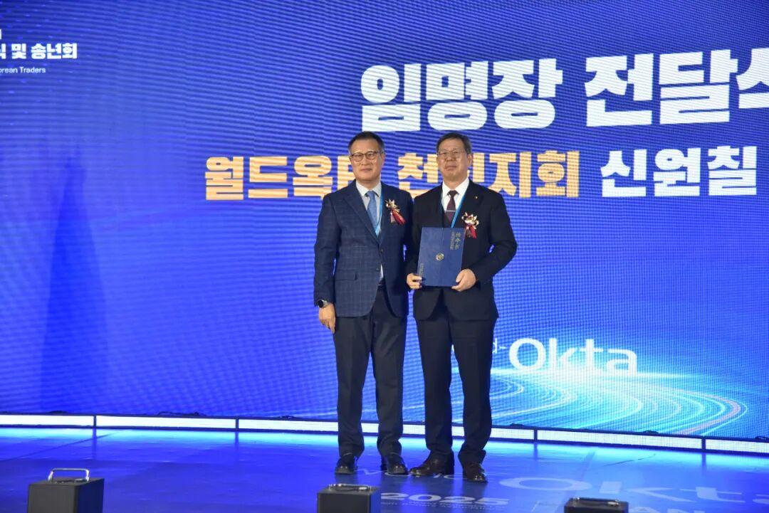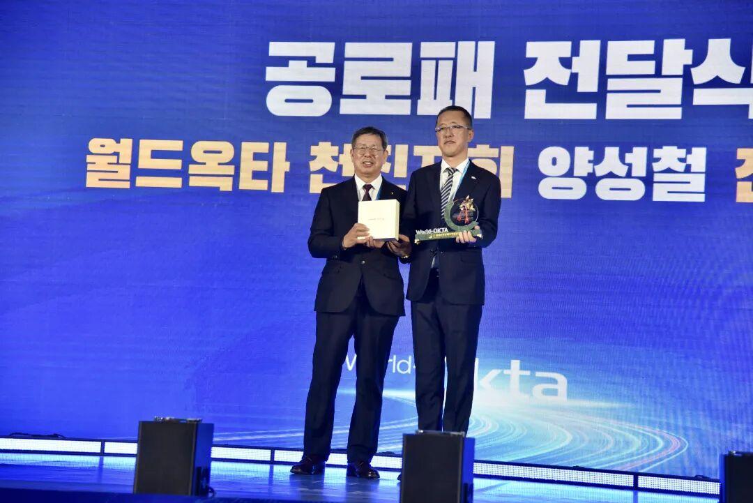 월드옥타 박종범 회장이 리광석(왼쪽) 중국회장단 의장에게 감사패를 전달하고 있다.