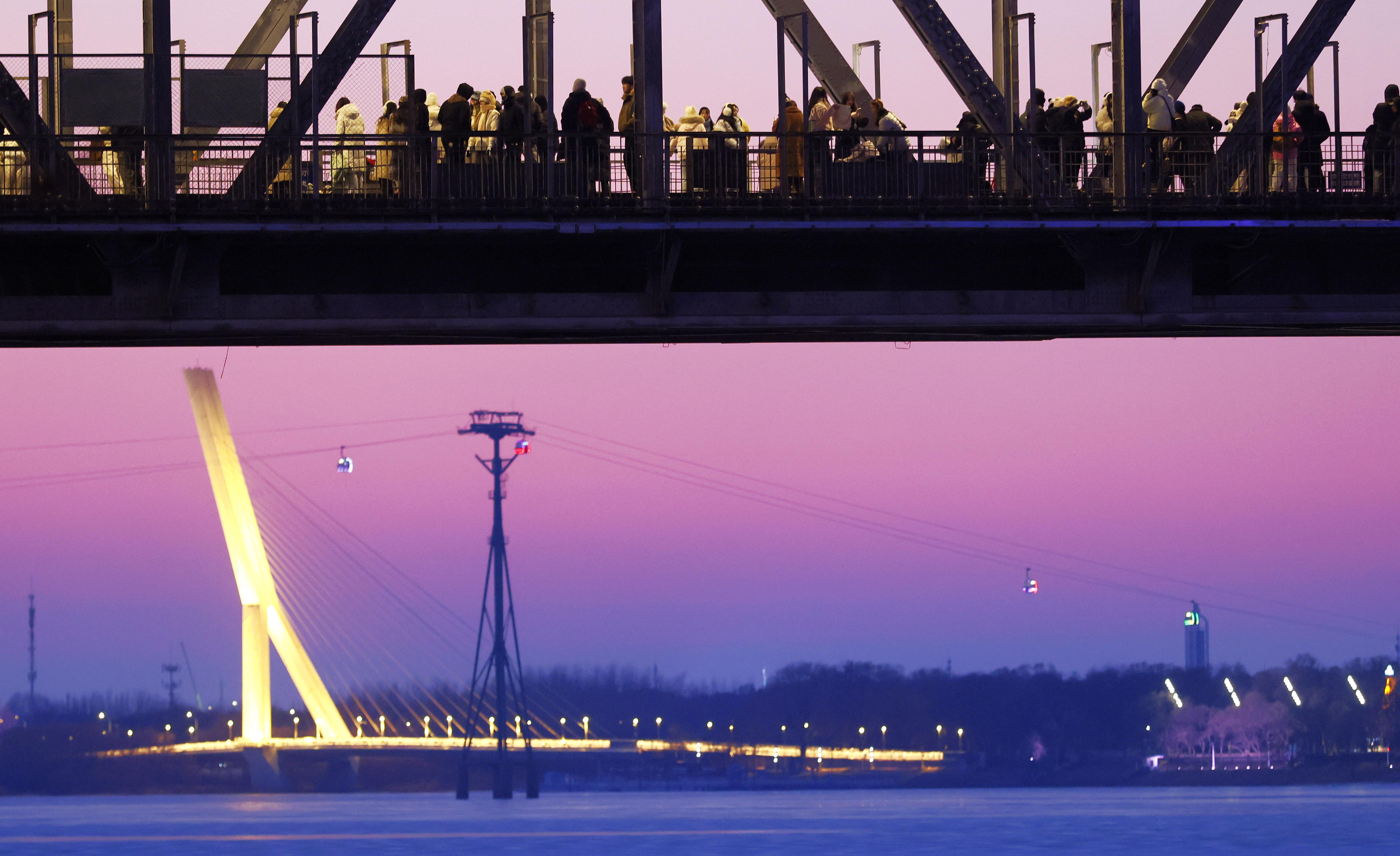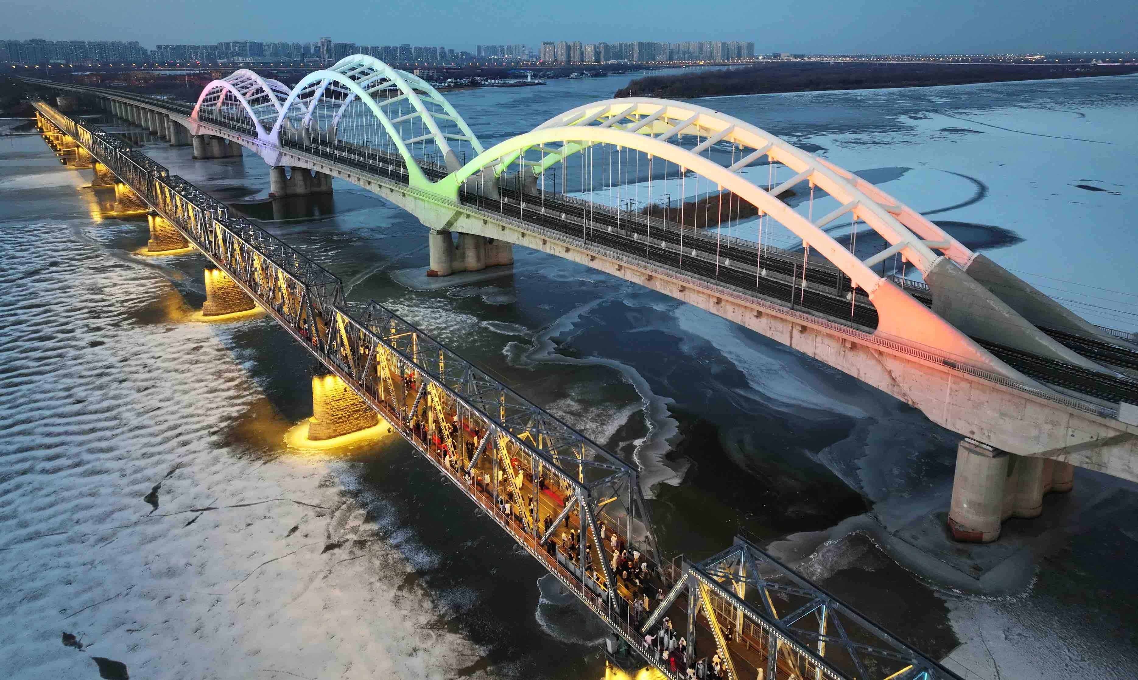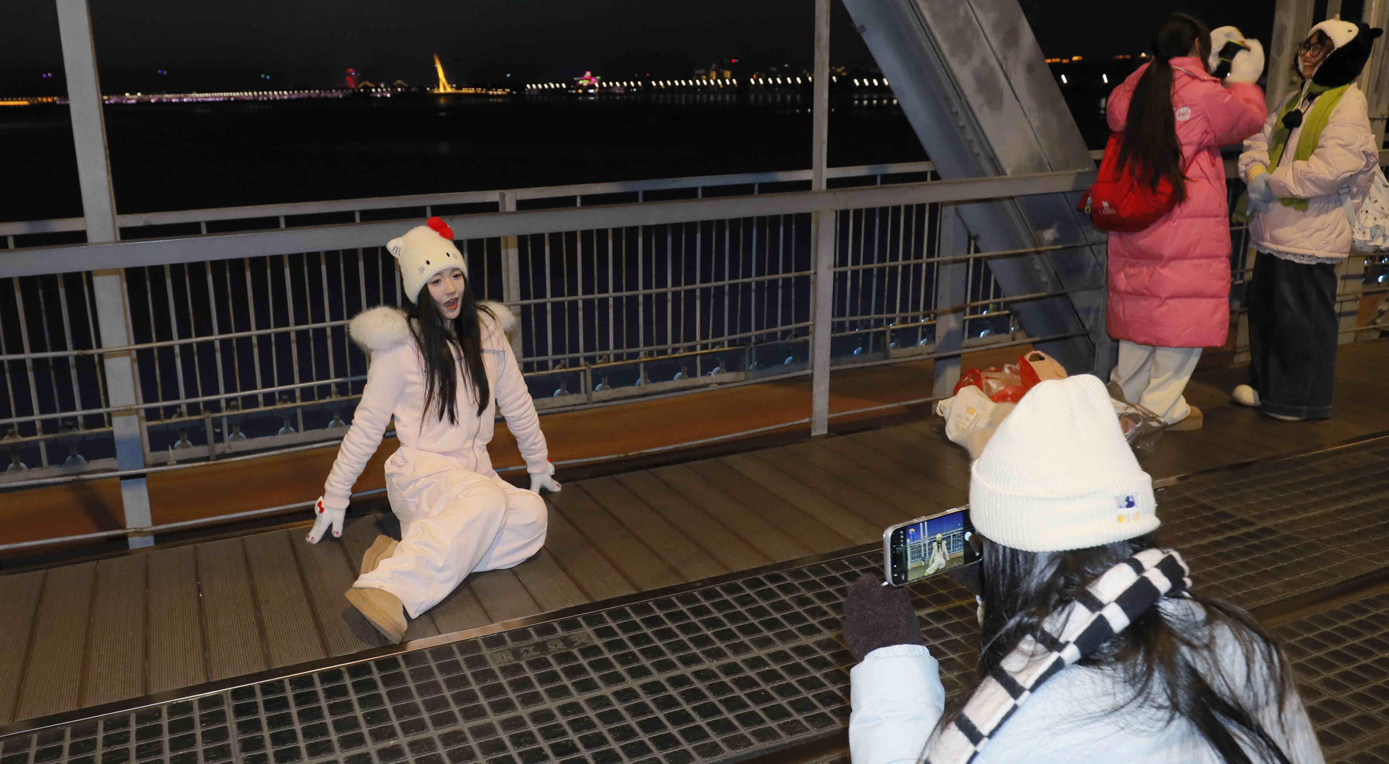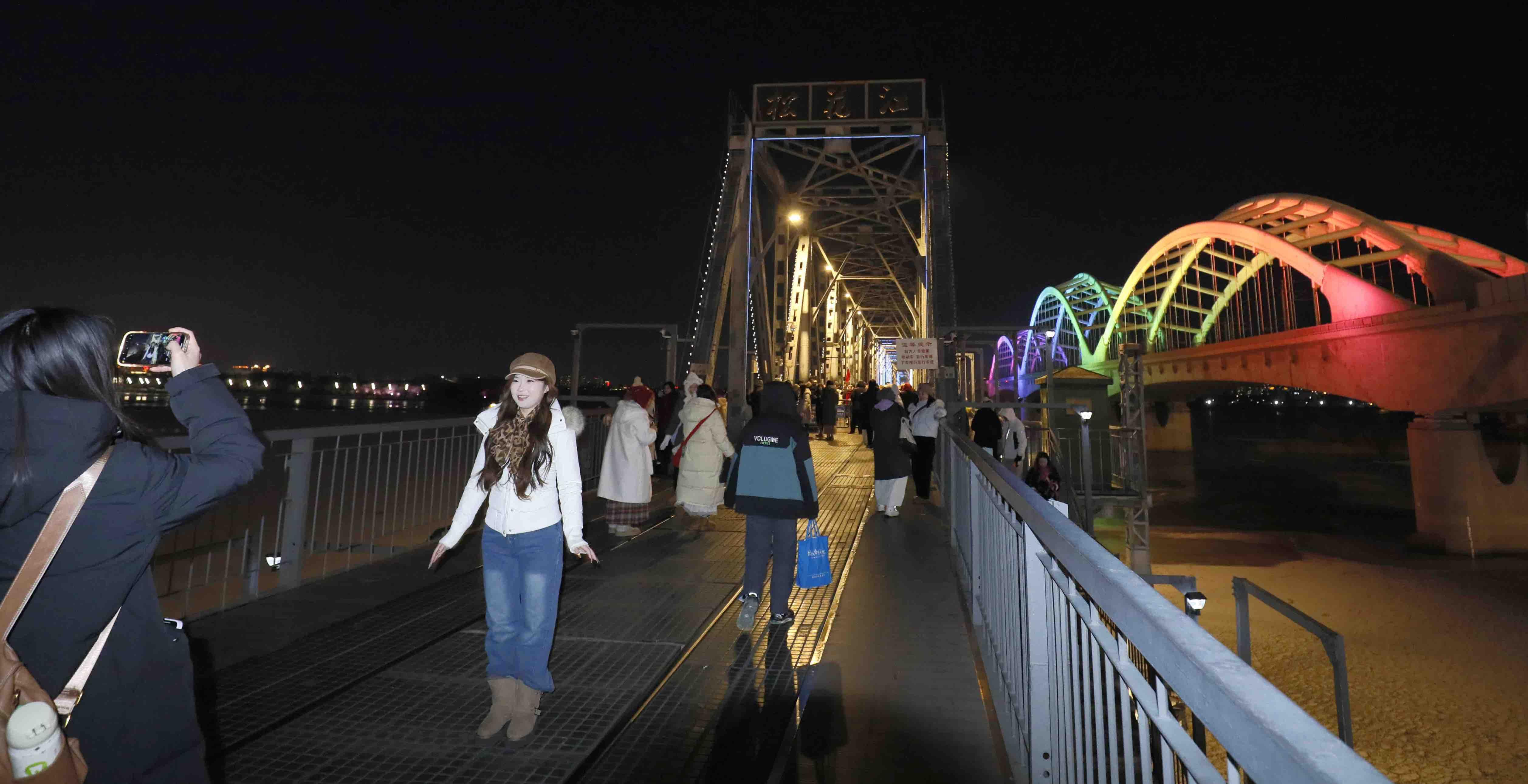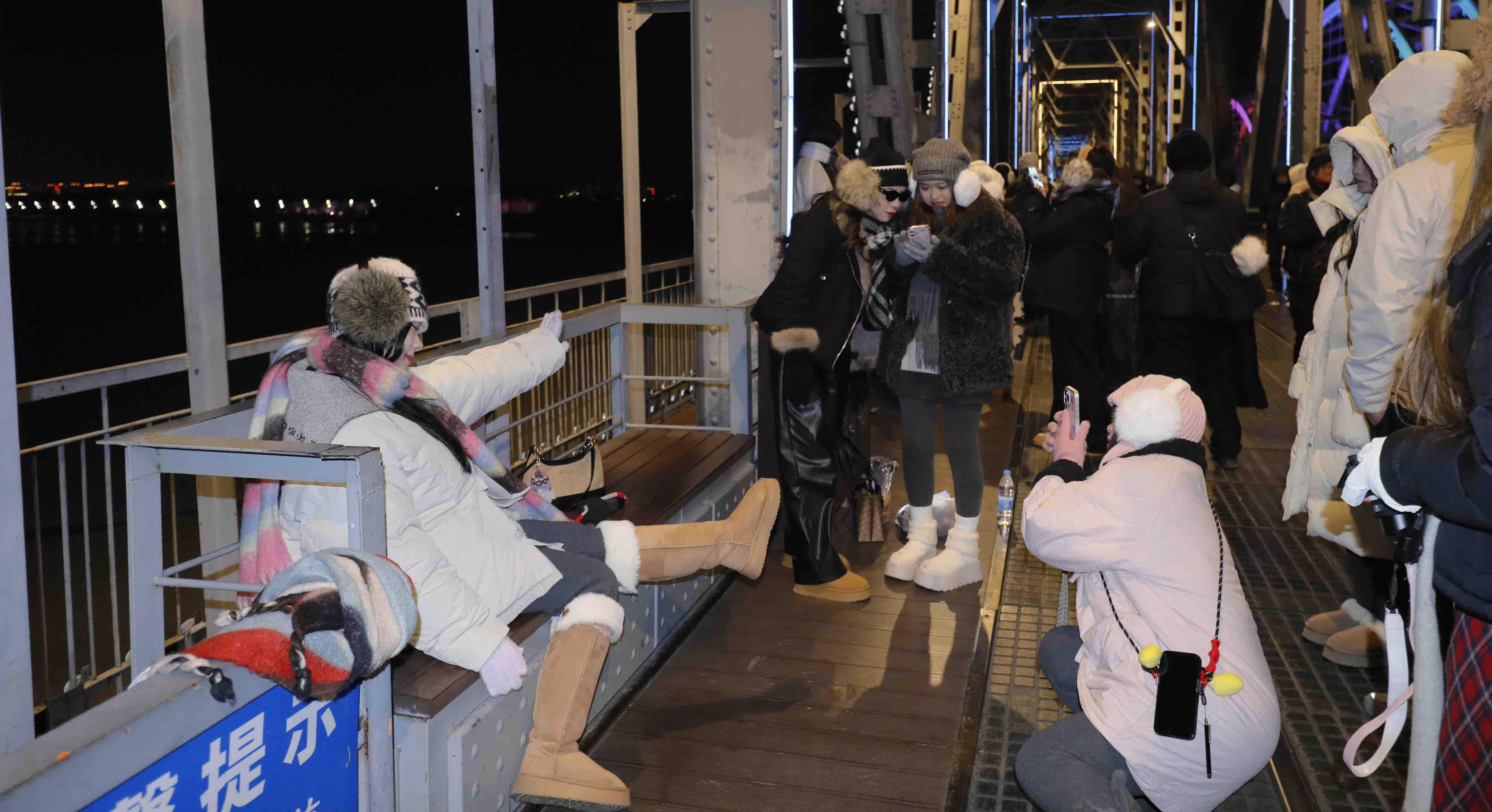 12월 2일, 할빈은 저온날씨를 맞이했다. 그러나 송화강 빈주철교는 관광객들이 끊이지 않았으며 겨울철 가장 뜨거운 명소로 자리 잡았다. 얇은 외투를 걸친 녀성들이 얼음으로 덮인 강면과 새하얀 눈을 배경으로 철교의 강철 구조를 배경 삼아 휴대폰이나 카메라로 차가운 바람 속 미소를 담아냈다. 그들은 란간에 가볍게 기대거나 발끝을 들어 멀리 바라보며 은빛으로 물든 얼음도시와 어우러져 생동감 넘치는 겨울 풍경을 완성했다.