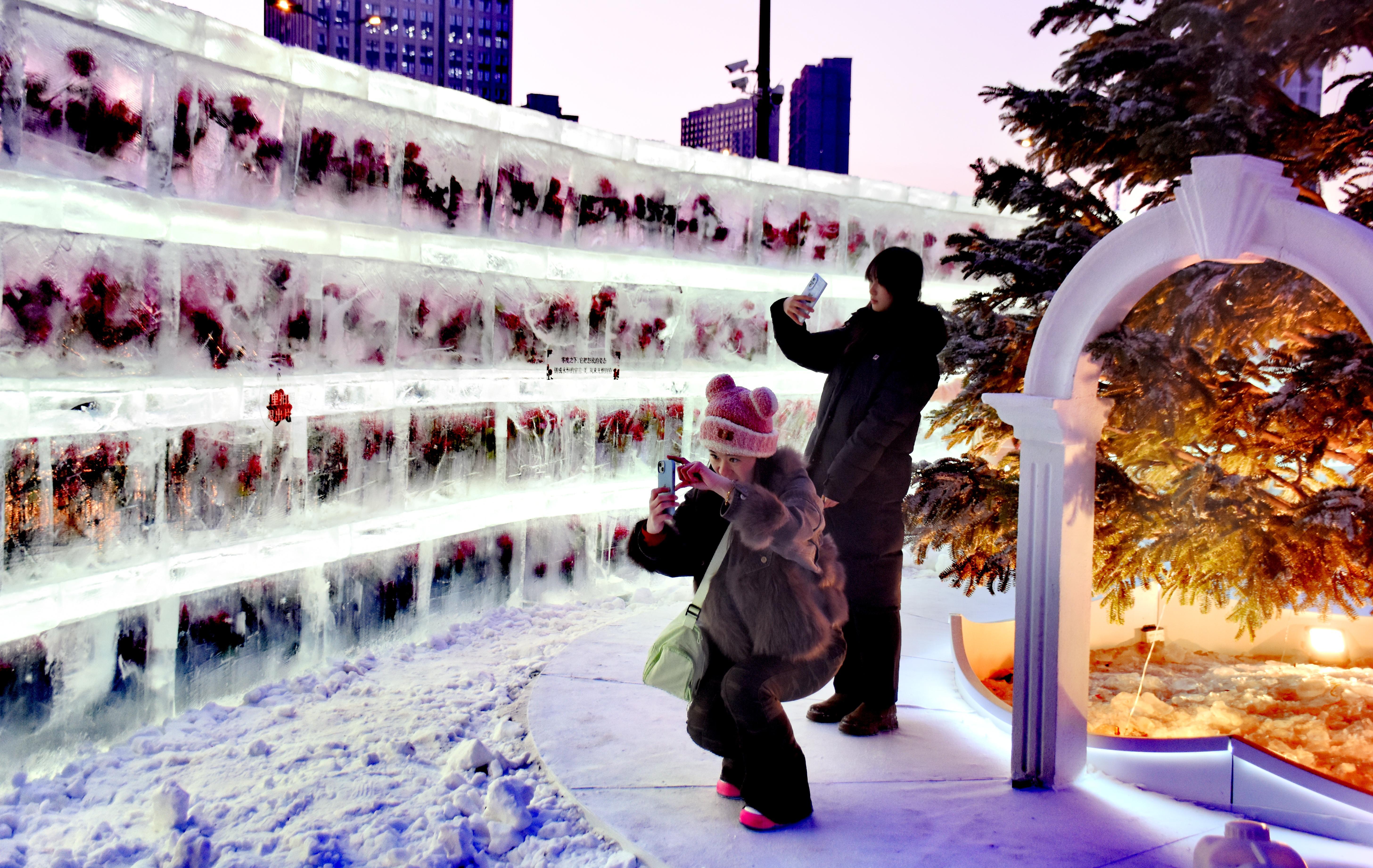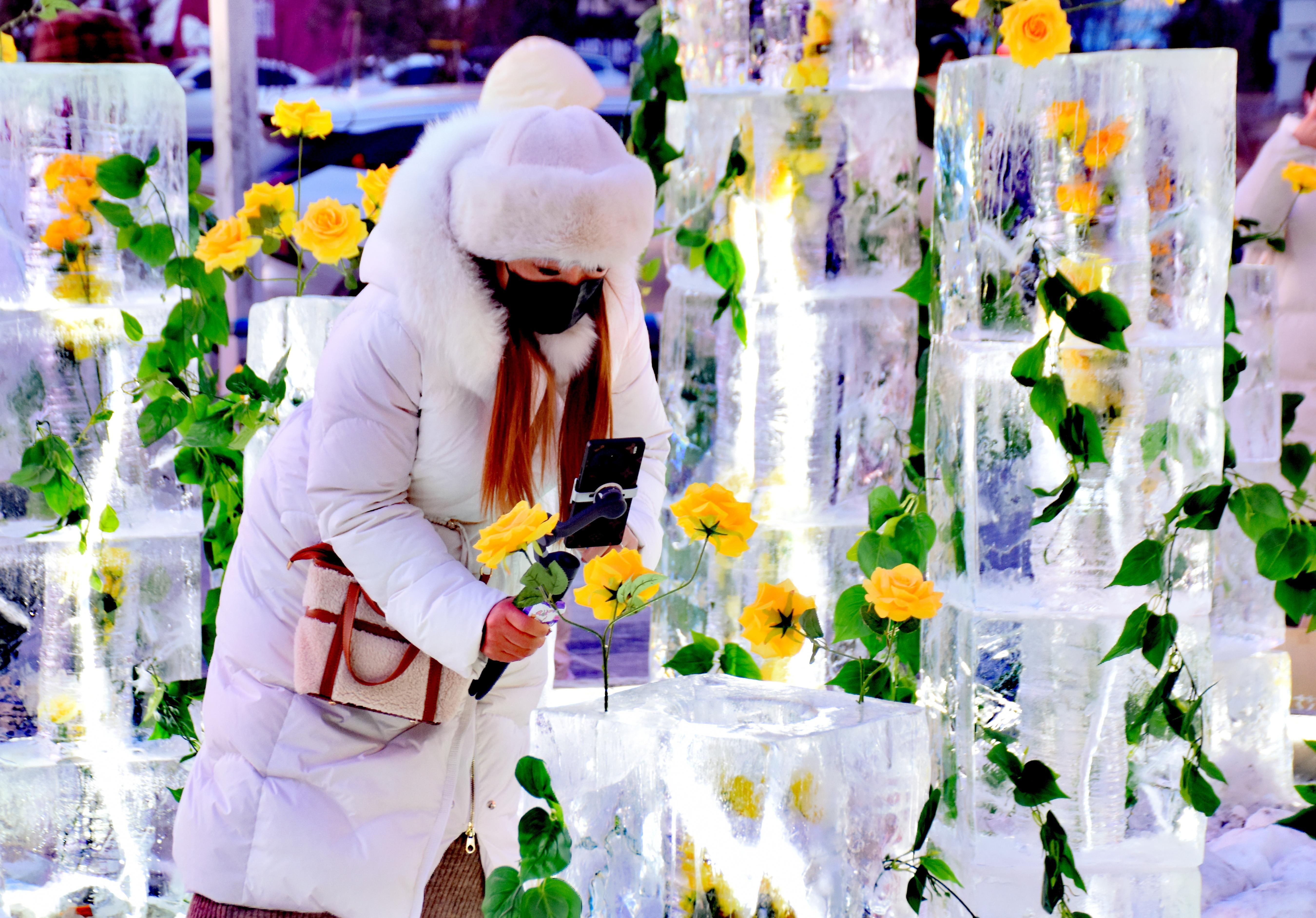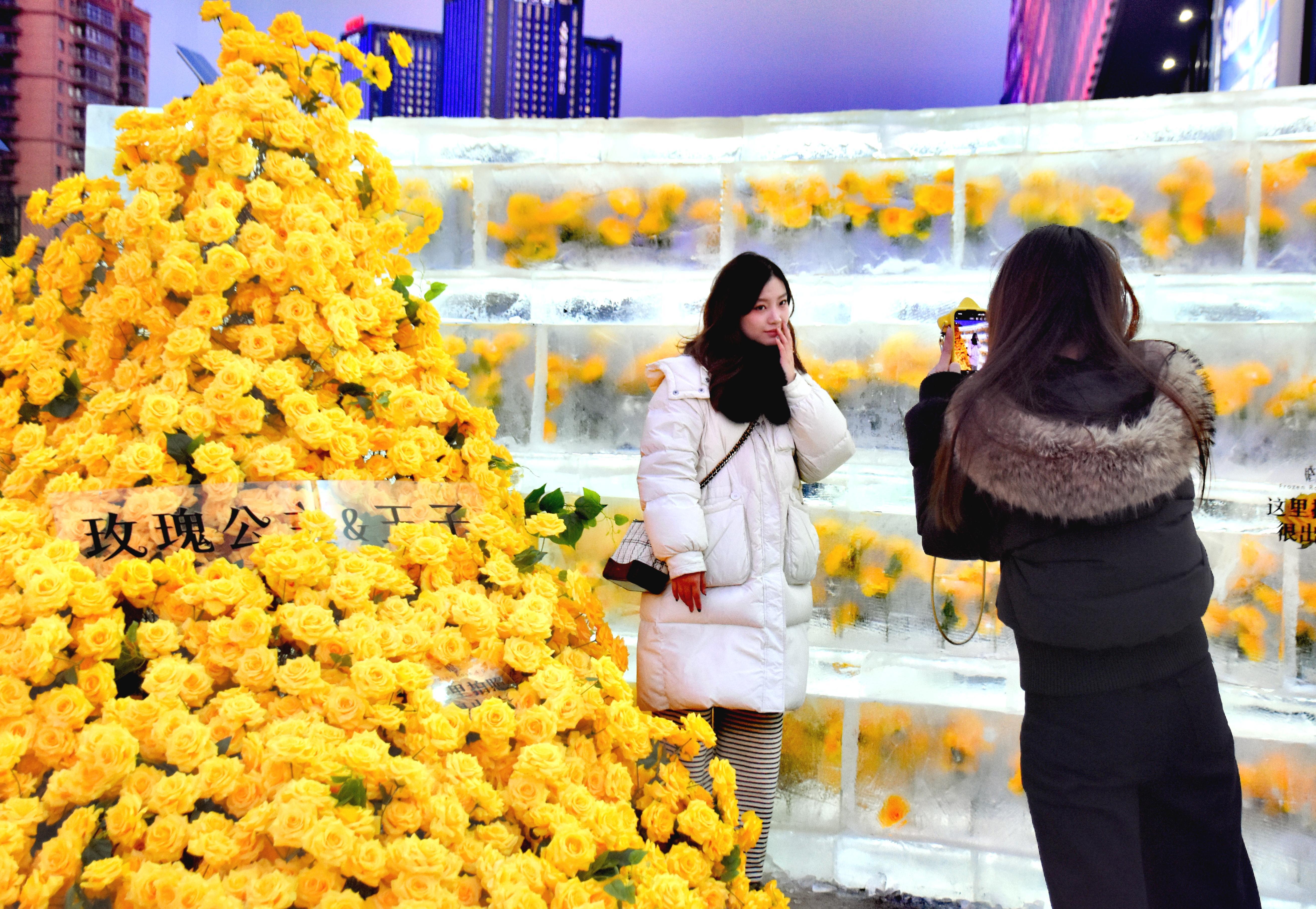 21일, 할빈시 남강구 중흥대가 근처의 상업거리에서 관광객들이 '얼음안에 봉인된 장미' 경관 옆에서 사진을 찍고 있다.