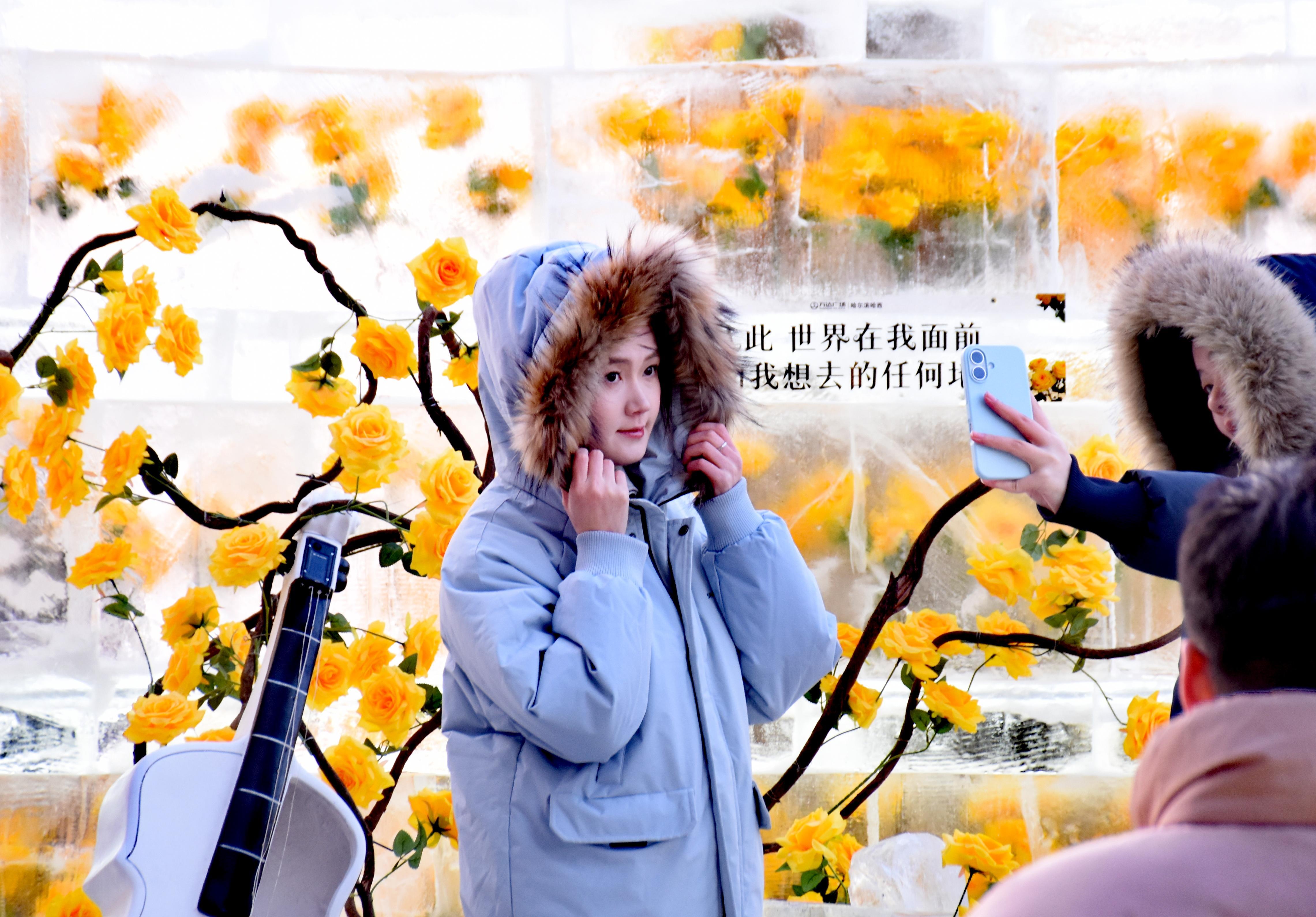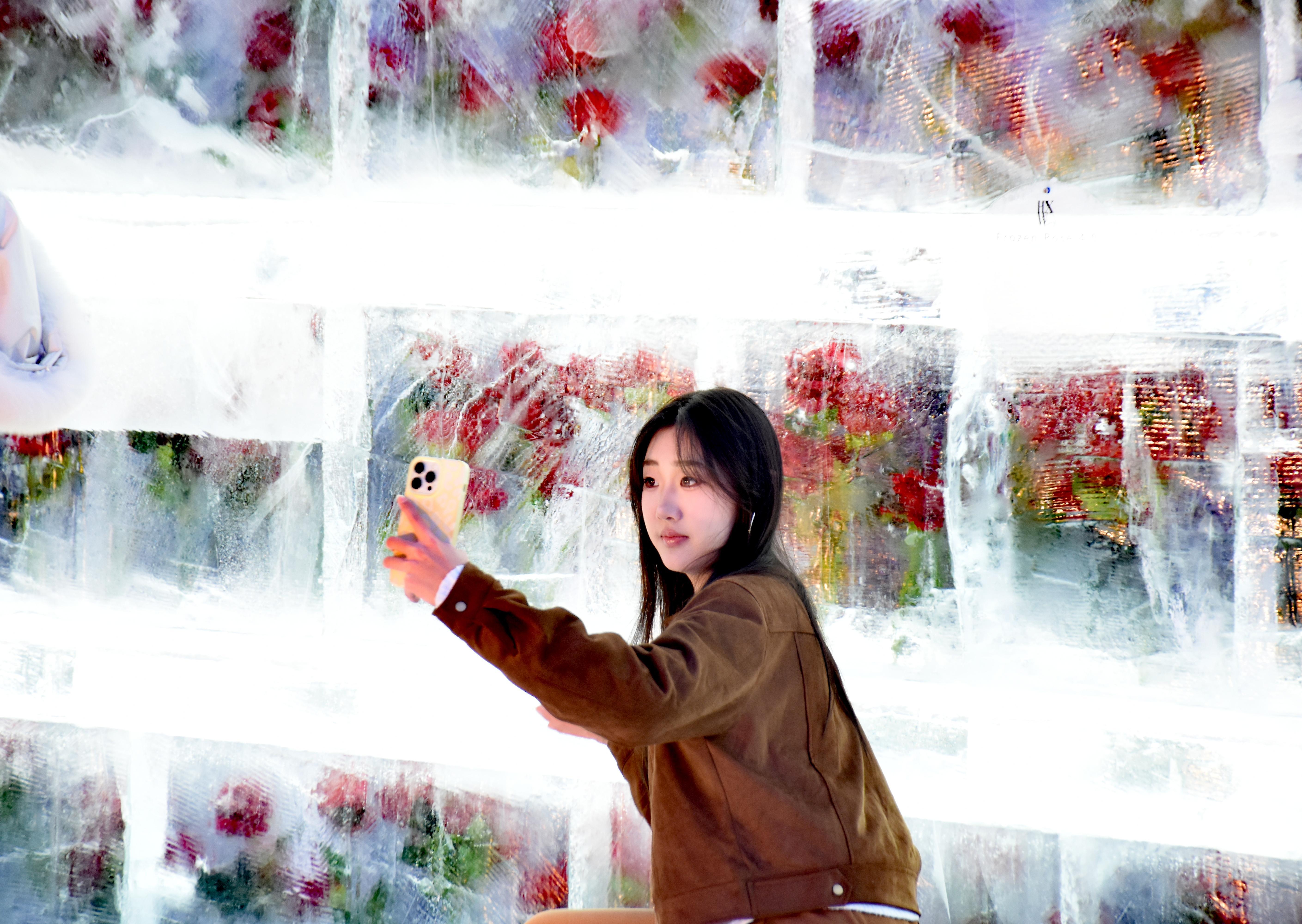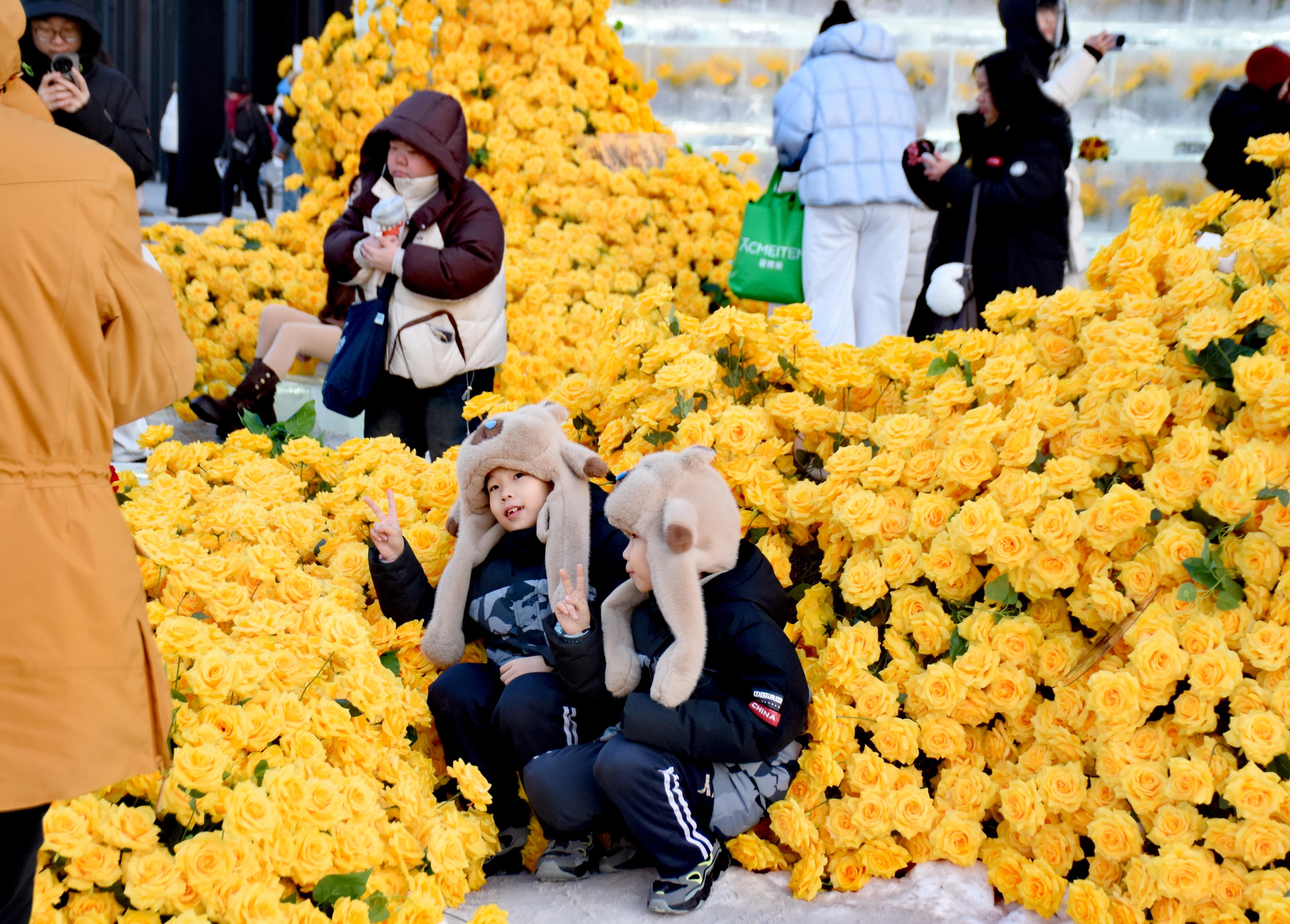 21일, 할빈시 남강구 중흥대가 근처의 상업거리에서 관광객들이 '얼음안에 봉인된 장미' 경관 옆에서 사진을 찍고 있다.