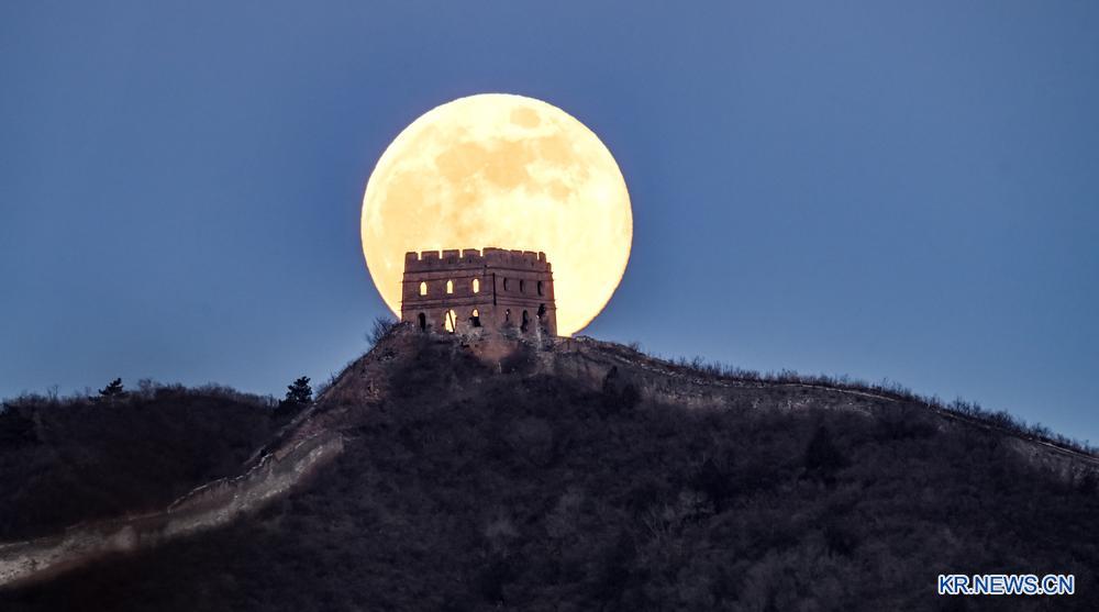 3일 북경시 밀운구 고북구진 반룡산 장성에 떠오른 슈퍼문.
