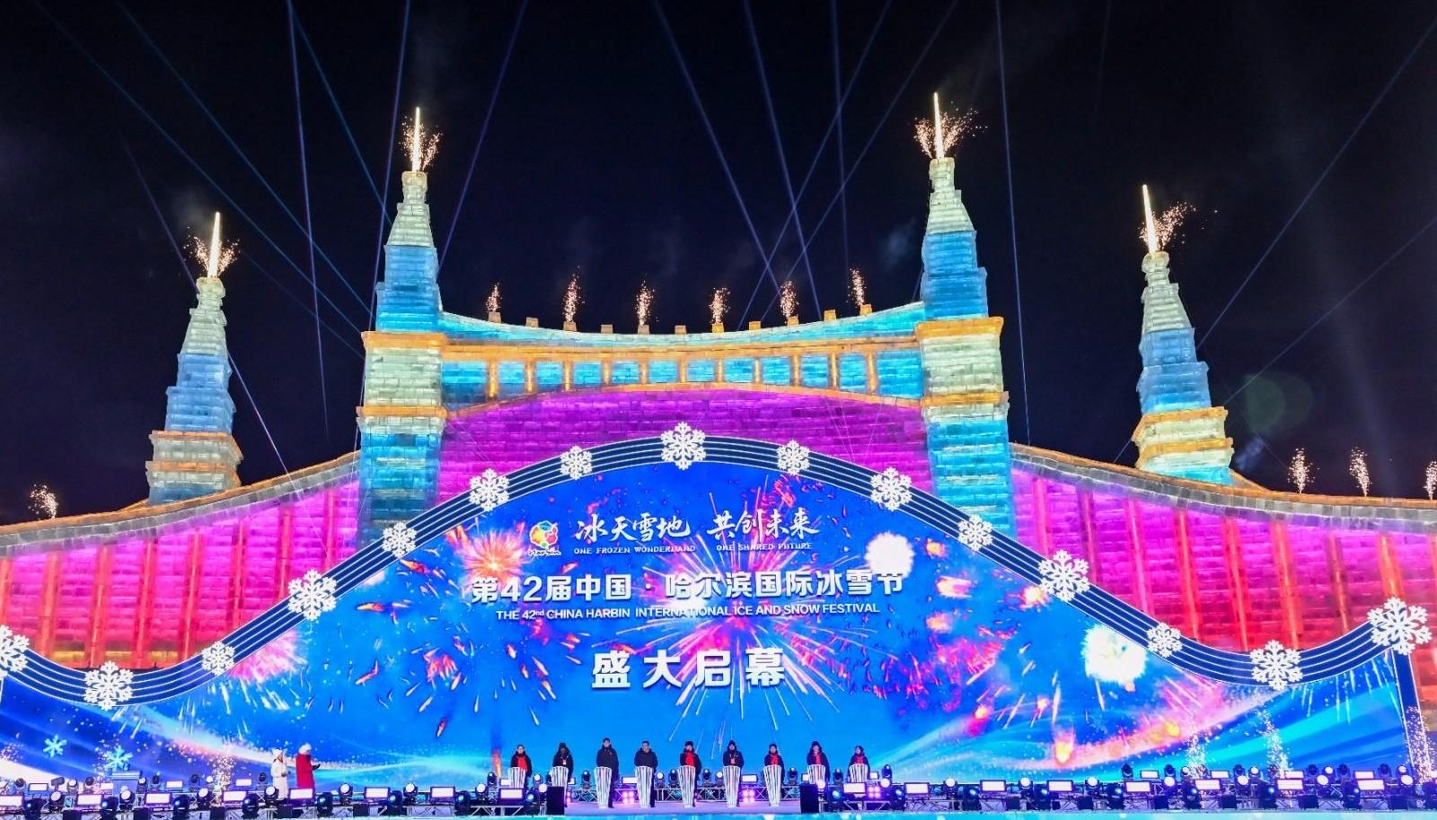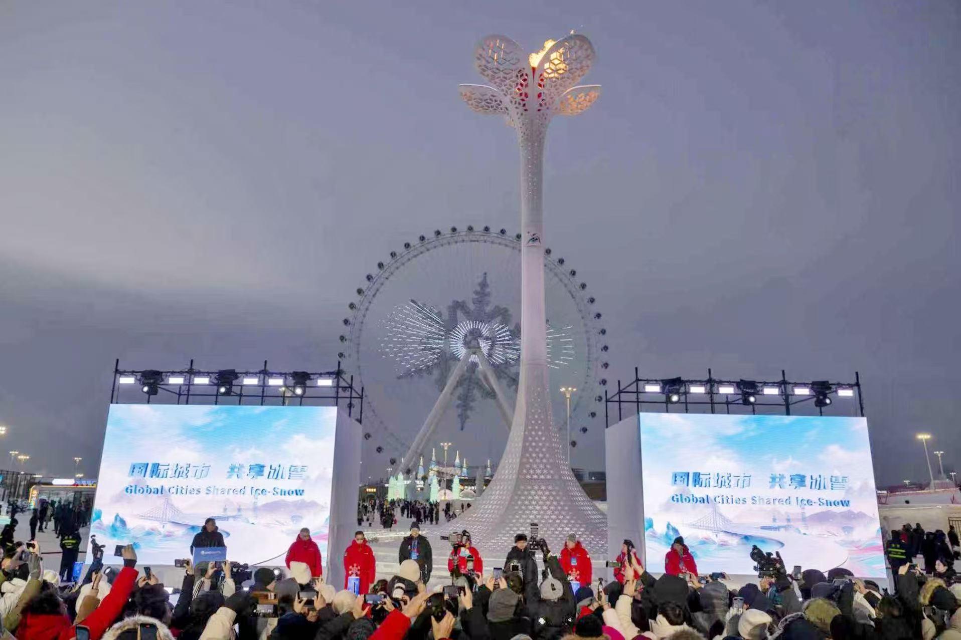 이날 오후 네시 경, 여러 나라의 시장(市长)들이 함께 스타트 버튼을 누르자 할빈빙설대세계의 찬란한 얼음 건축 경관과 '설운 정향' 동계아시안게임 성화탑이 동시에 점화되였고 빙설 예술의 웅장한 기운과 독특한 창의가 빛을 발했다.