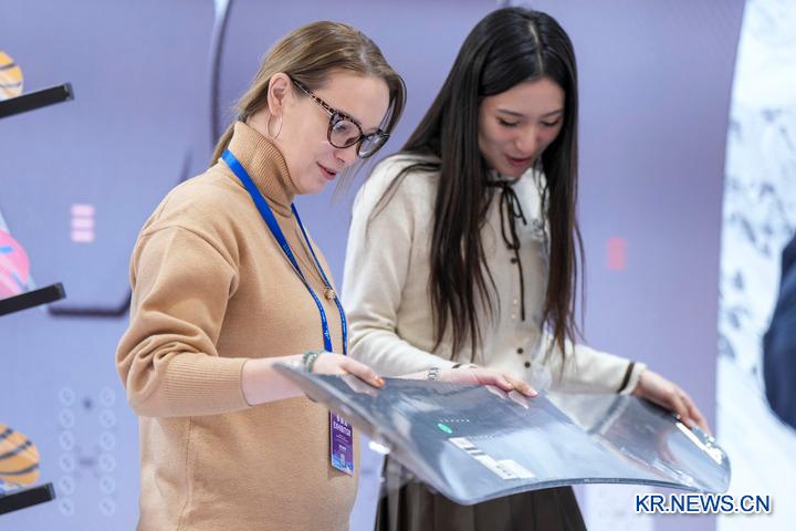'2026할빈국제빙설경제박람회' 참가자(왼쪽)가 방문객에게 스마트 탄소섬유 스노보드의 성능을 소개하고 있다. (사진/신화통신)