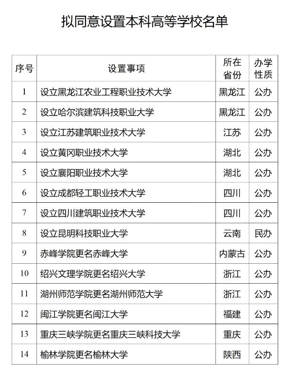 <중화인민공화국 고등교육법>, <일반고등학교 설립에 관한 잠정규정>, <일반본과학교 설립에 관한 잠정규정>, <본과 수준의 직업학교 설립기준(시행)> 및 기타 관련 규정에 따라 교육부 당조회의 심의를 거쳐 흑룡강농업공학직업기술대학을 포함한 14개 학교의 설립을 동의할 예정이며 이를 공시했다. 공시기간은 2026년 1월 12일부터 1월 16일까지이다.