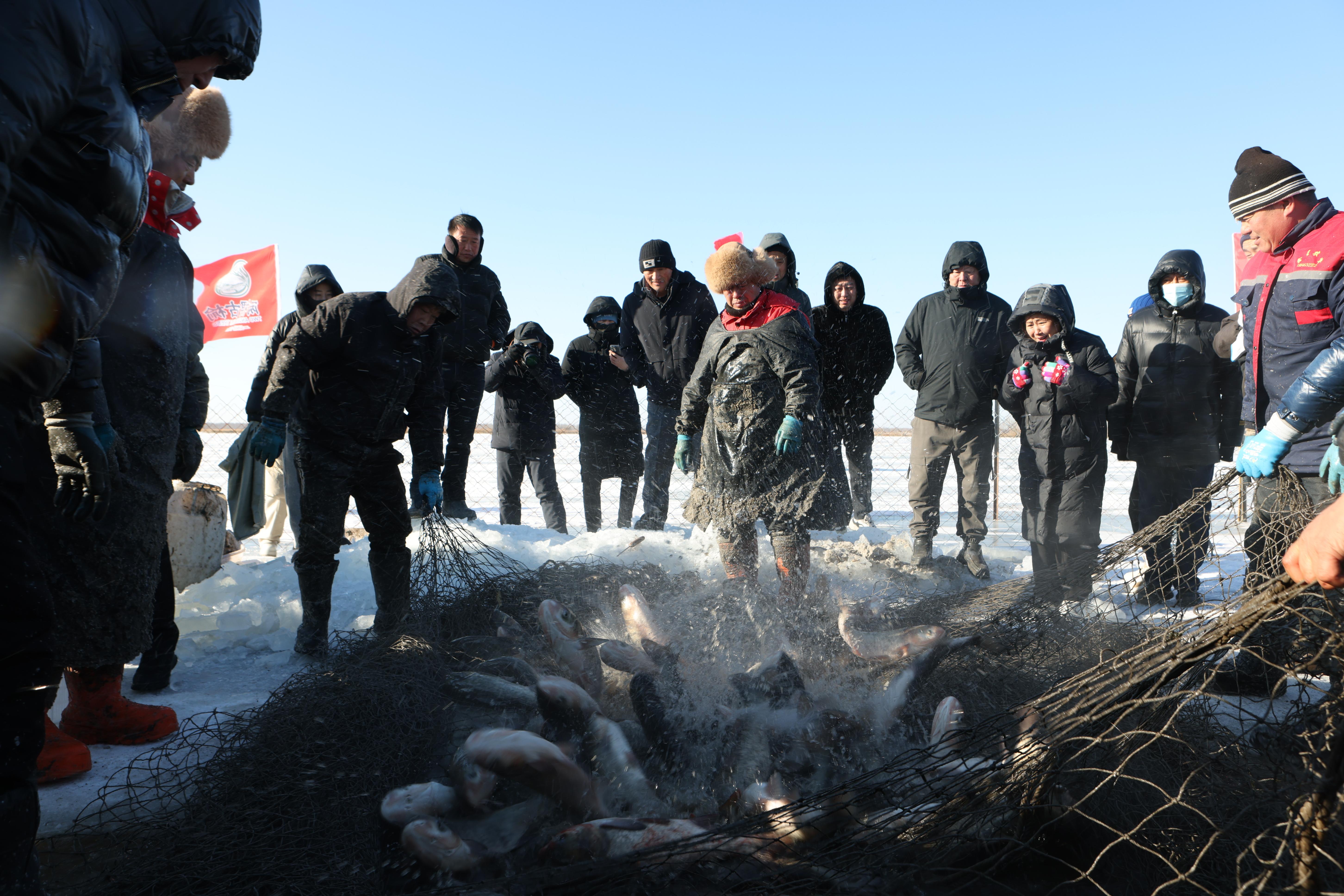 고조된 그물 끌어올림 소리와 함께 길이 1000미터에 달하는 어망이 얼음구멍에서 천천히 끌어올려졌고 잉어, 연어, 대머리물고기 등 다양한 강물고기가 그물 안에서 팔딱거리며 은빛 비늘이 아침 해살에 반짝였다.