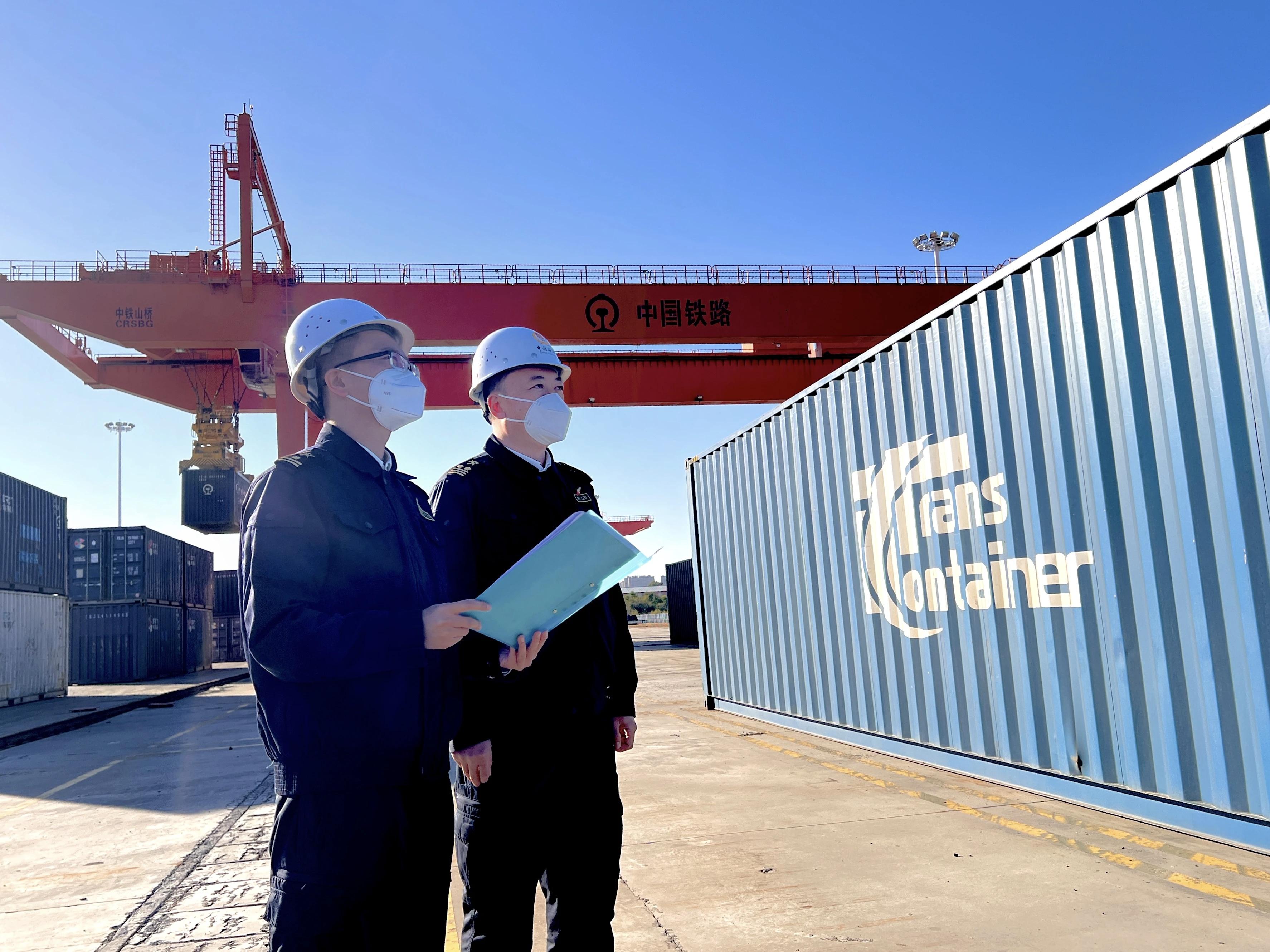 할빈세관 직원이 중유럽 렬차 수출 화물을 검사하고 있다.