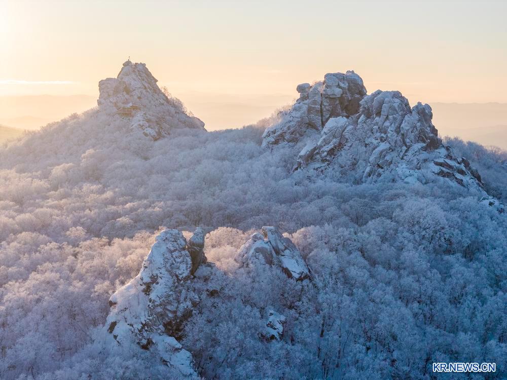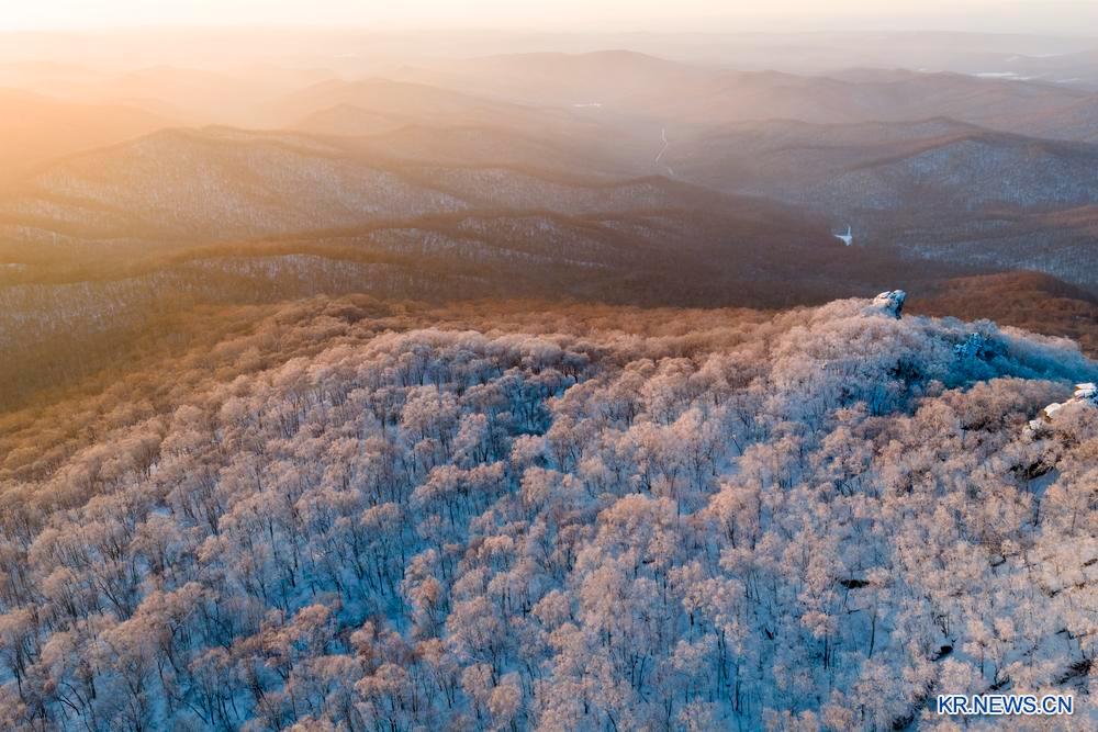 25일 아침, 흑룡강성 쌍압산시에 위치한 칠성산국가삼림공원에 상고대가 형성됐다. 아침해살 아래 산을 뒤덮은 상고대가 장관을 이뤘다. 이날 칠성산국가삼림공원의 상고대를 드론으로 내려다봤다.