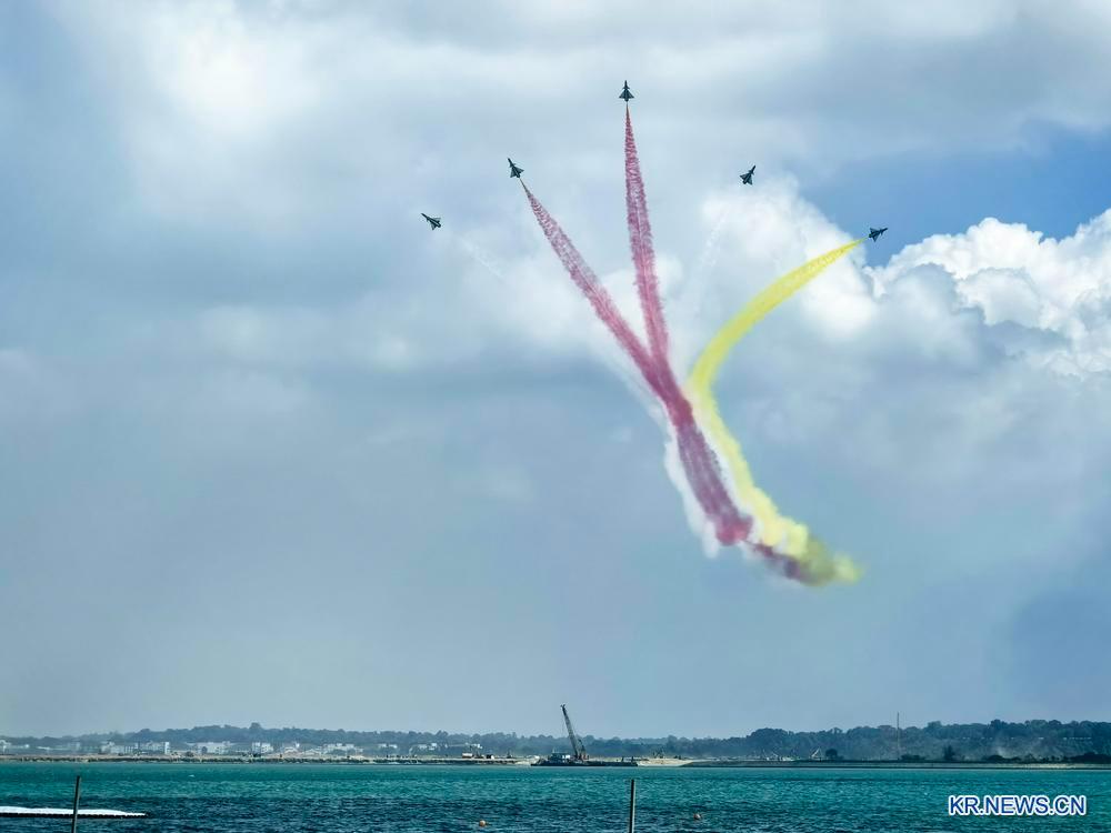 이날 싱가포르 창이 전시센터에서 열린 싱가포르 에어쇼 미디어 리허설에서 중국 공군 팔이(八一)곡예비행팀이 시험 비행을 진행하고 있다.