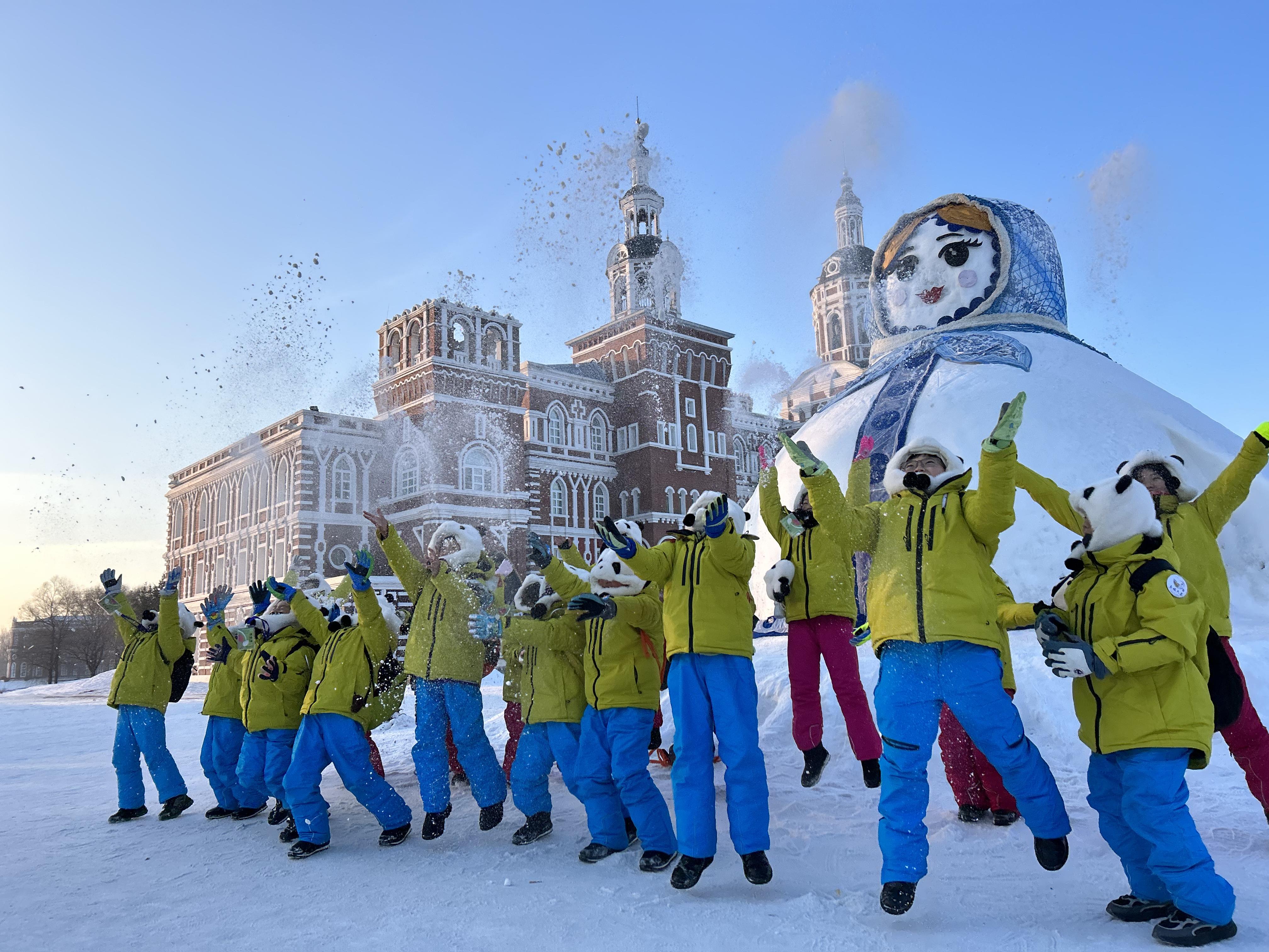 사천성에서 온 연학팀이 할빈볼가장원에서 즐겁게 눈놀이를 하고 있다.