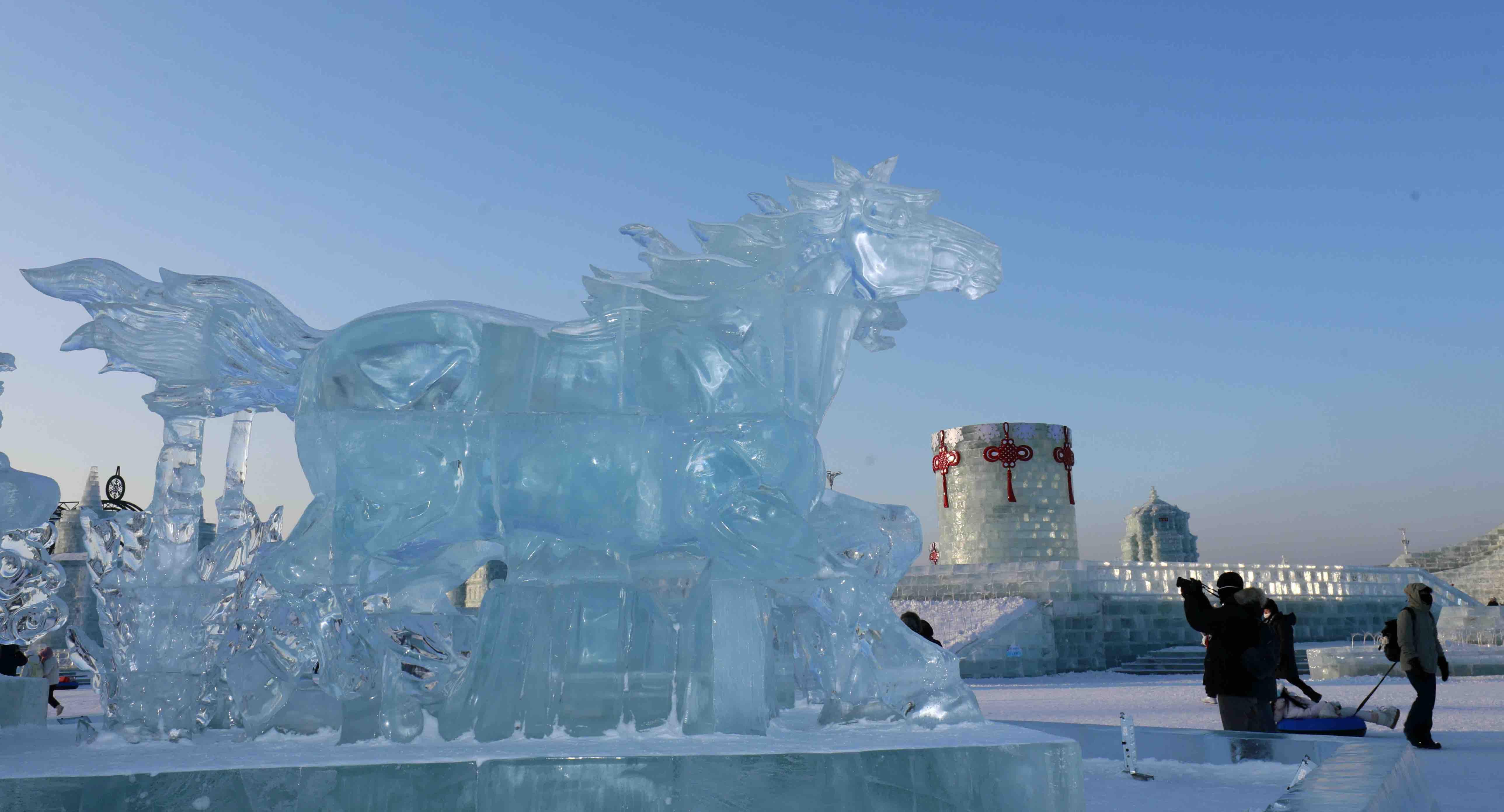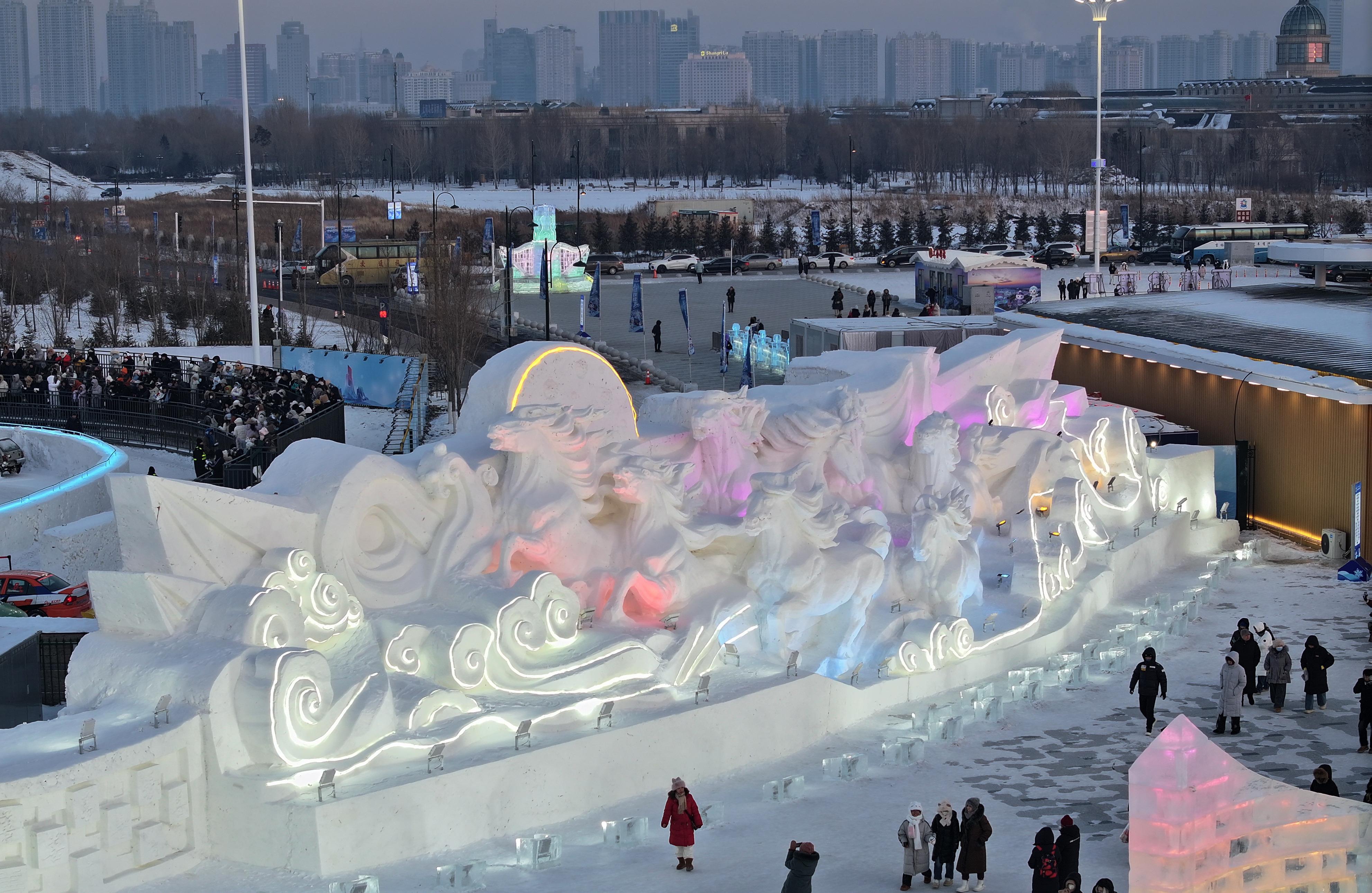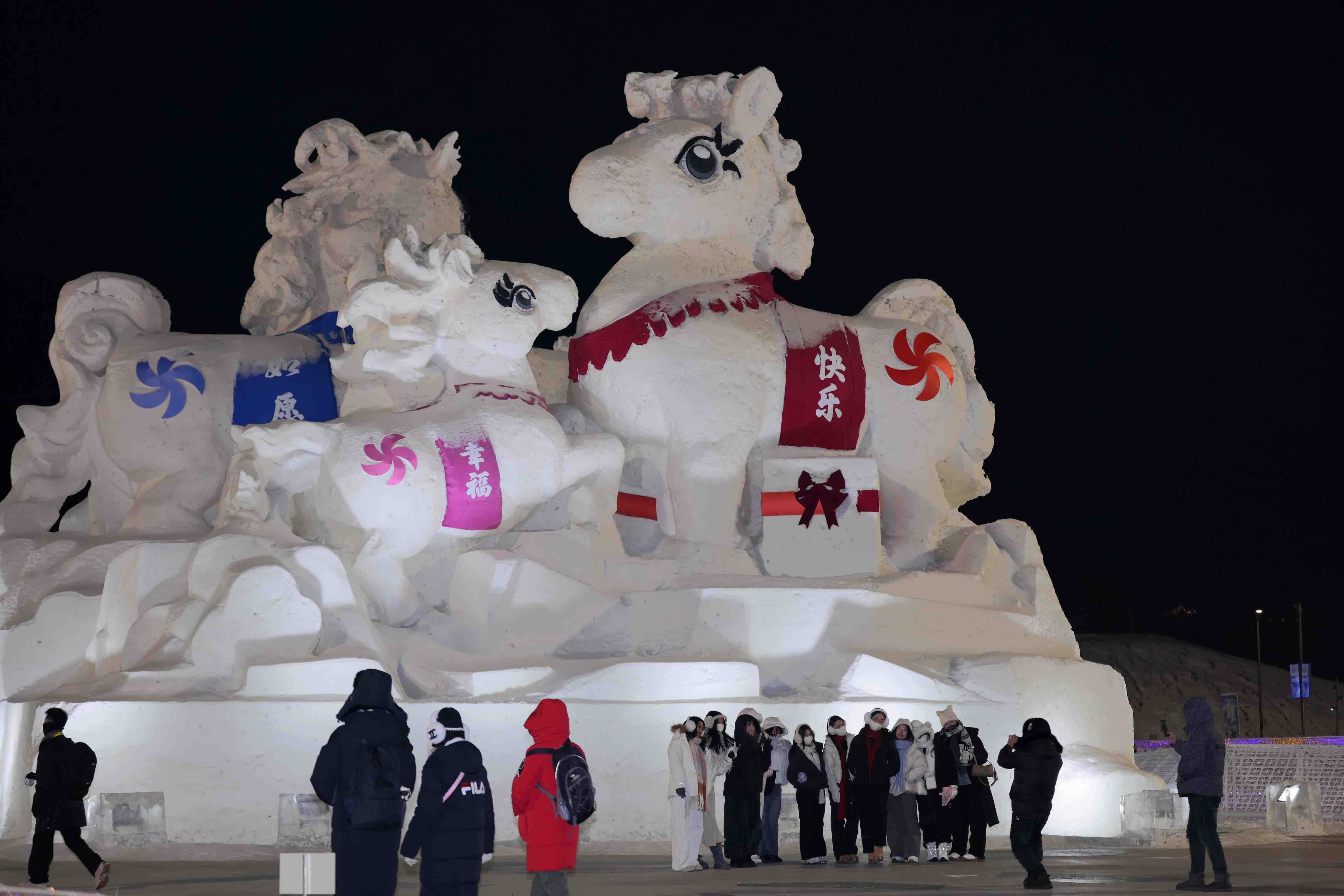 말띠해가 다가옴에 따라 할빈빙설대세계 관광지 내에 '말'을 주제로 한 얼음조각과 눈조형물 작품군이 눈부시게 등장하여 관광객들이 줄지어 방문하고 있다. 반짝이는 얼음조각의 준마는 고개를 들고 힘차게 뛰여오르며 눈조형물의 말무리는 생동감 넘쳐 빛 아래에서 형형색색으로 빛나 마치 북국 겨울풍경의 활력과 새봄의 경사를 하나로 융합한 듯 하다. 관광객들은 발걸음을 멈추고 이 독특한 예술의 향연을 감상하며 렌즈를 통해 이 장면을 기록하고 찬바람 속에서 새봄에 대한 아름다운 기대를 키워가고 있다.