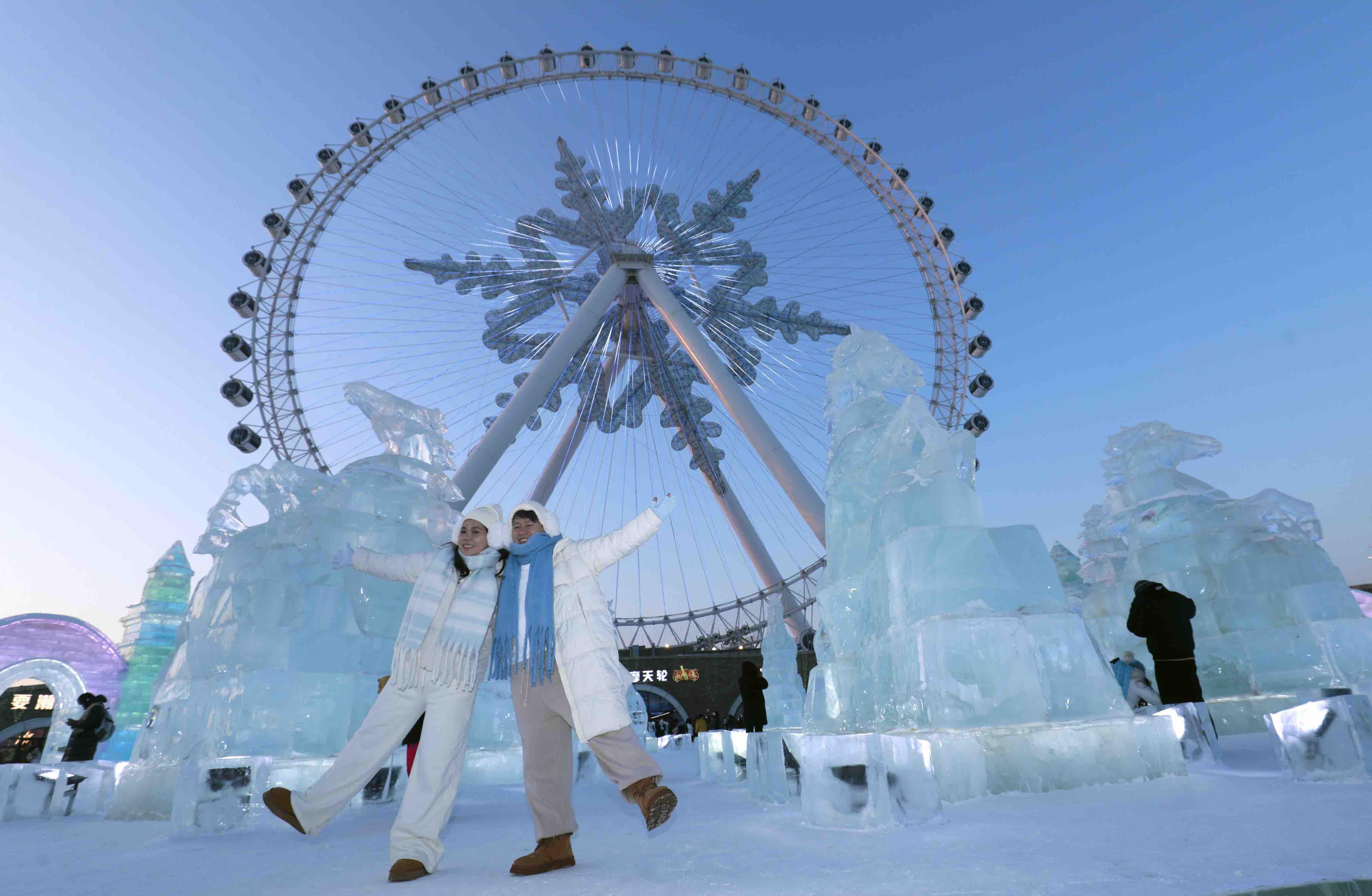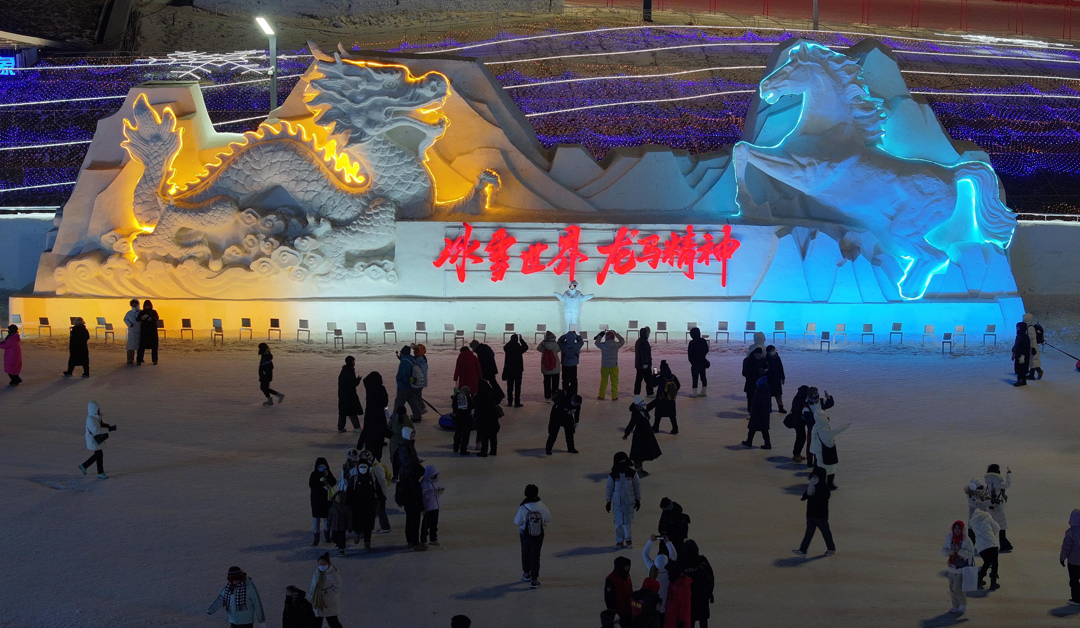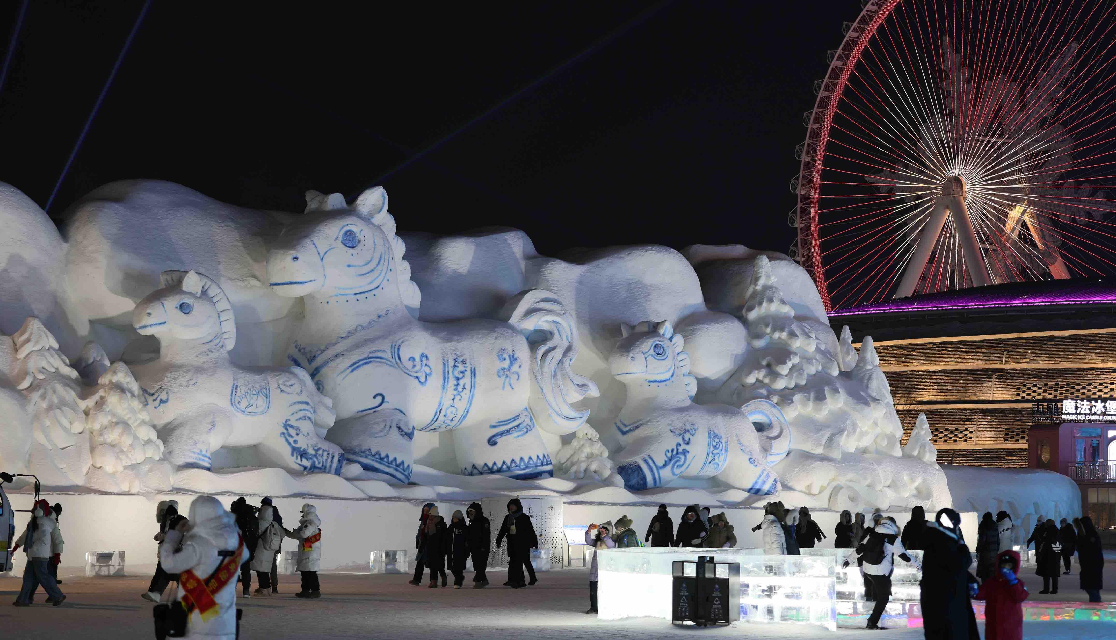 말띠해가 다가옴에 따라 할빈빙설대세계 관광지 내에 '말'을 주제로 한 얼음조각과 눈조형물 작품군이 눈부시게 등장하여 관광객들이 줄지어 방문하고 있다. 반짝이는 얼음조각의 준마는 고개를 들고 힘차게 뛰여오르며 눈조형물의 말무리는 생동감 넘쳐 빛 아래에서 형형색색으로 빛나 마치 북국 겨울풍경의 활력과 새봄의 경사를 하나로 융합한 듯 하다. 관광객들은 발걸음을 멈추고 이 독특한 예술의 향연을 감상하며 렌즈를 통해 이 장면을 기록하고 찬바람 속에서 새봄에 대한 아름다운 기대를 키워가고 있다.