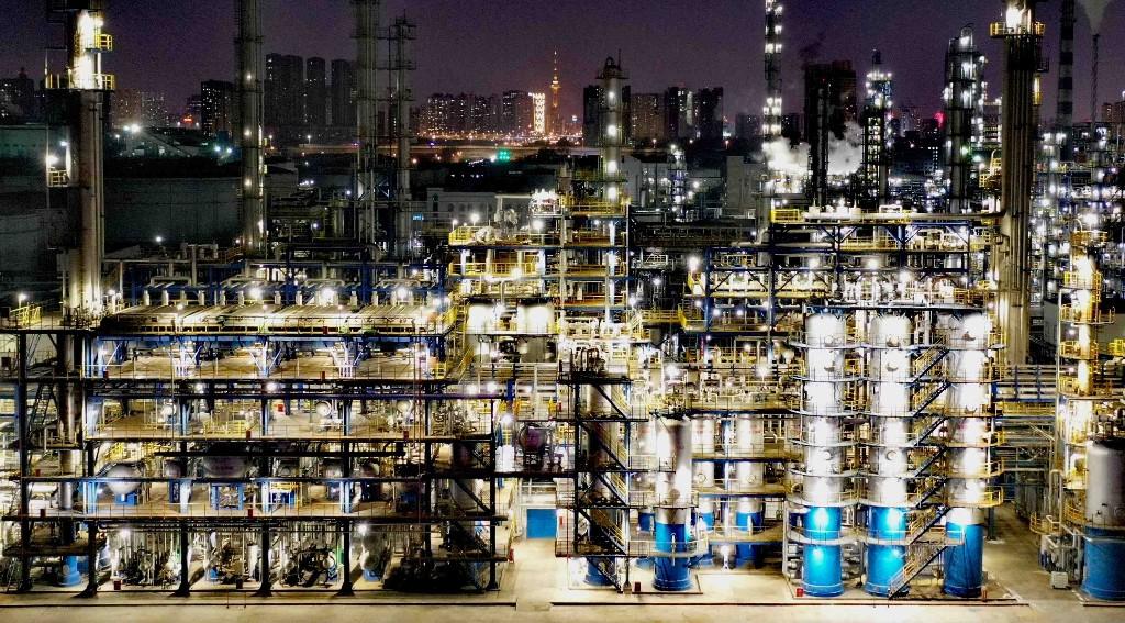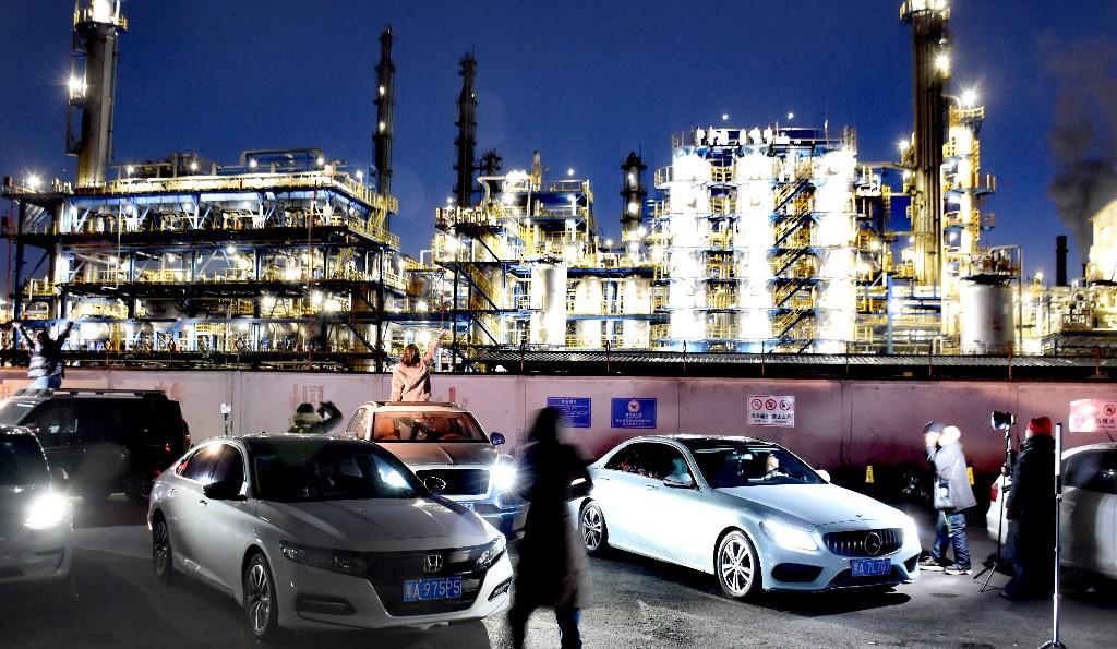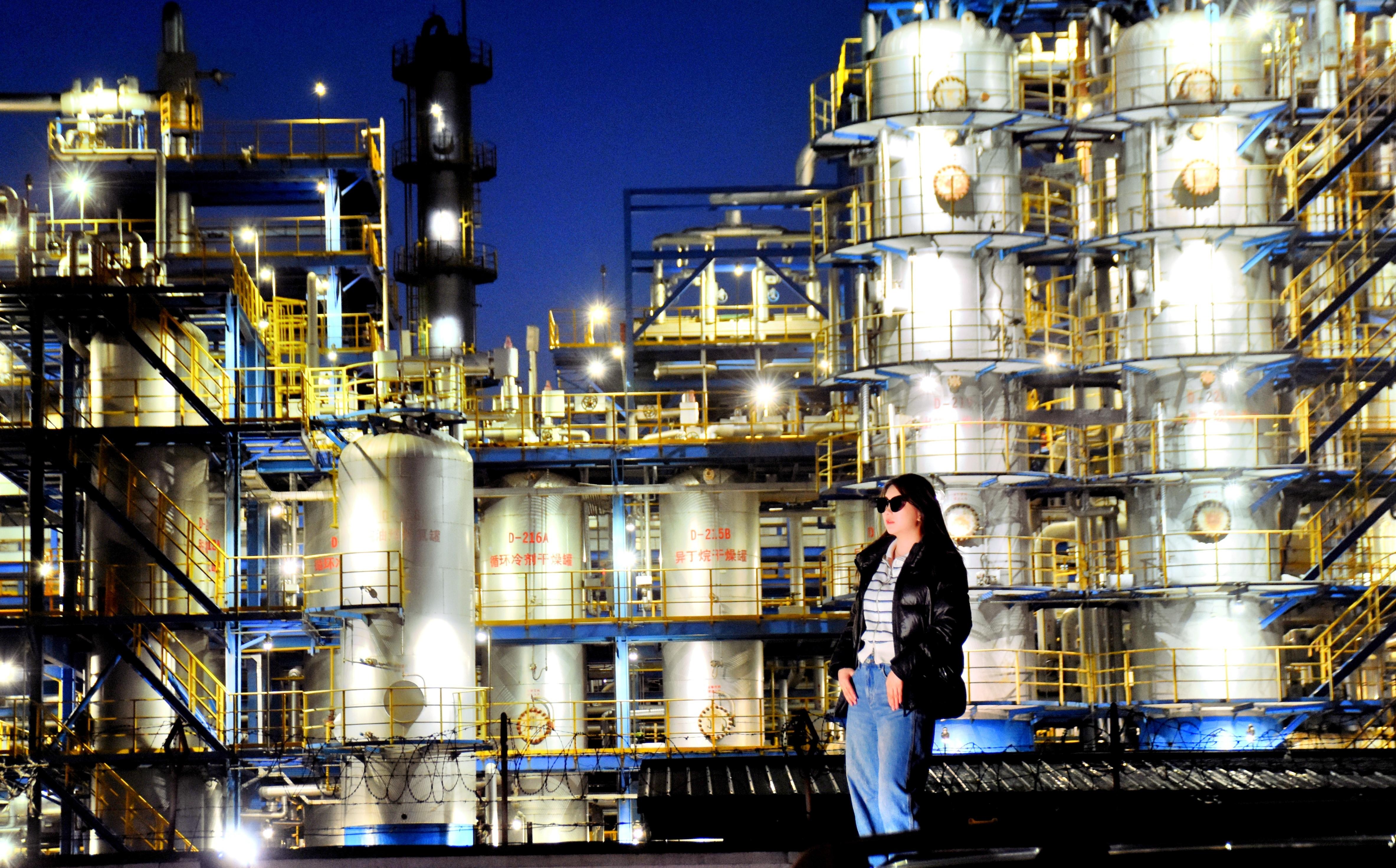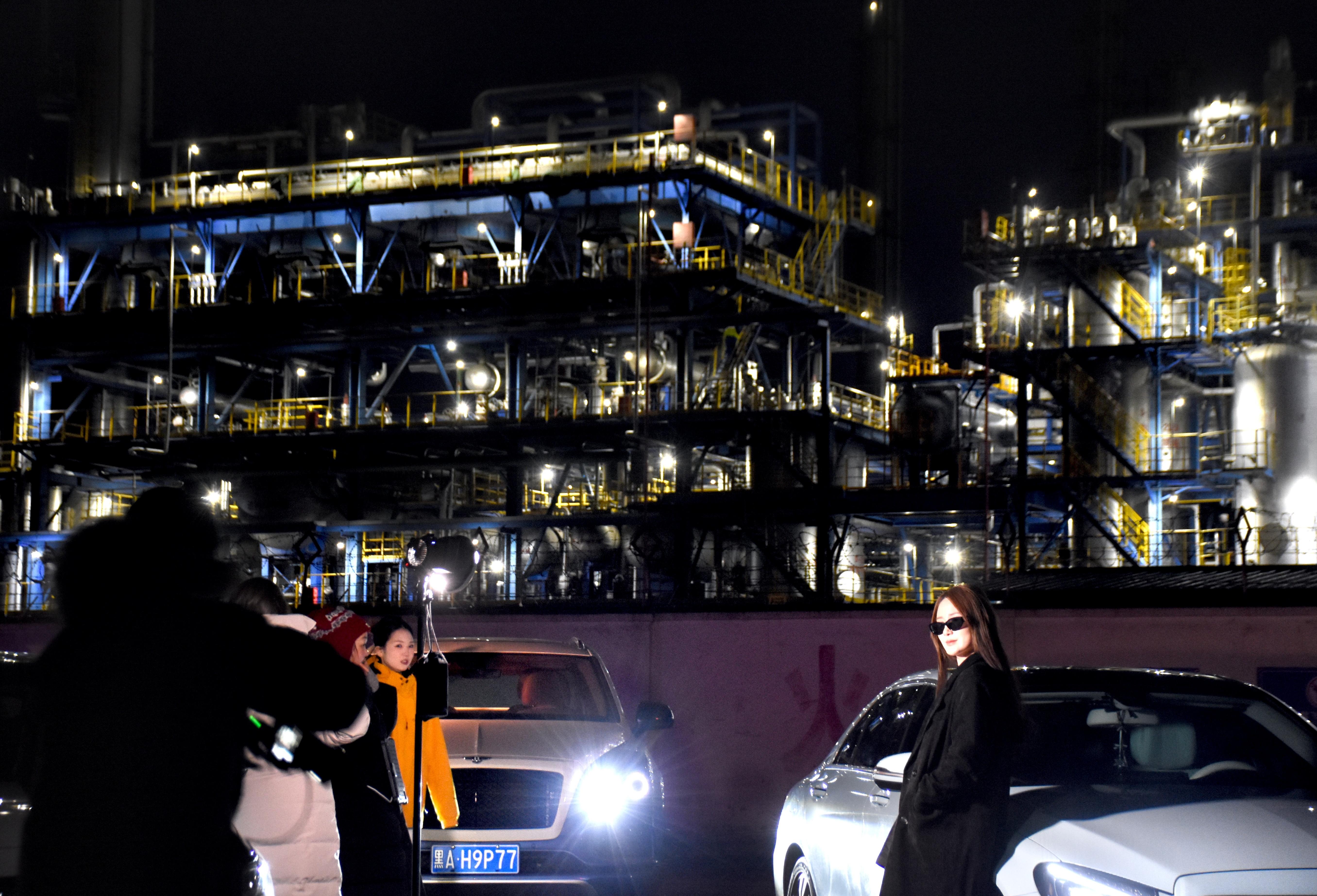 11일 밤, 할빈시 도외구 희룡대로 부근. 많은 시민과 관광객들이 화려하게 불을 밝힌 화학공장을 배경으로 사진을 찍고 있다.