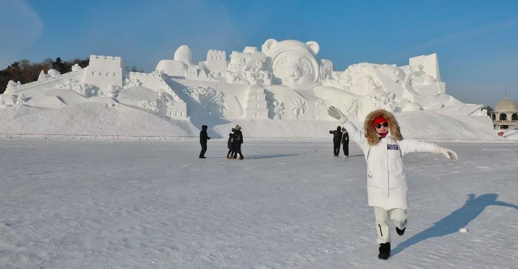 관광객, 눈조각품 앞에서 기념사진 촬영.