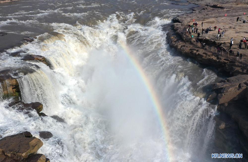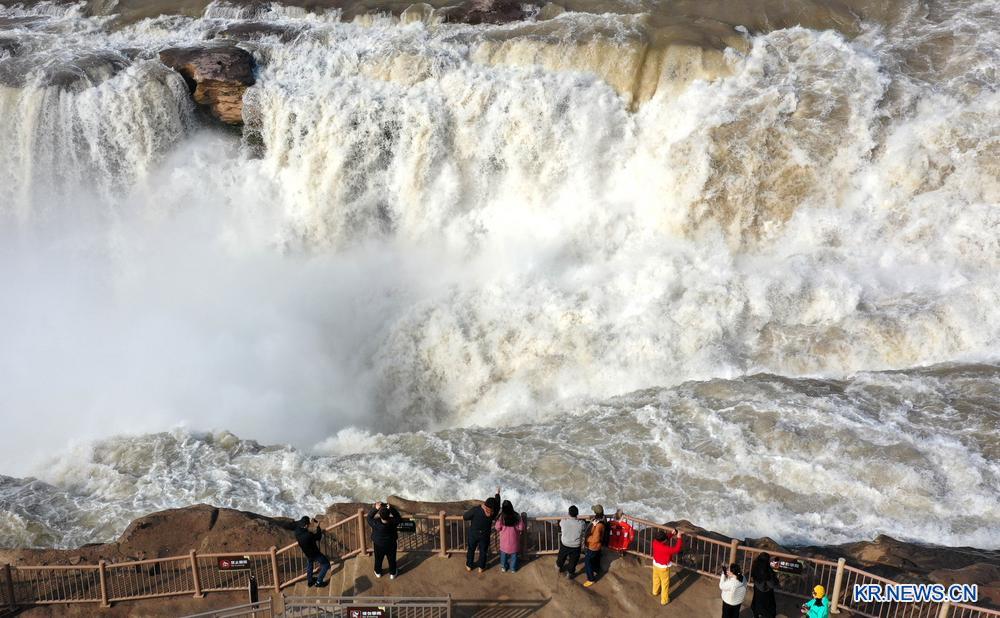 이날 황하 호구 폭포 관광지를 둘러보고 있는 관광객들을 드론으로 담았다.