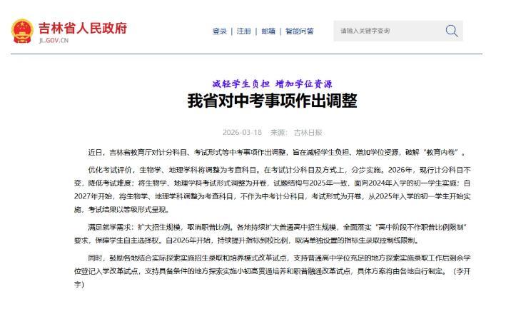 길림일보 소식에 따르면 최근 길림성교육청은 고중입시사항에 대해 조정을 진행했다. 2027년부터 생물학, 지리학을 고찰과목으로 조정하고 고중입시 채점과목에서 제외한다. 시험형식은 개방형 시험이고 2025년 입학하는 중학교 1학년 학생부터 시행대상이 되며 시험결과는 등급형식으로 표현된다.