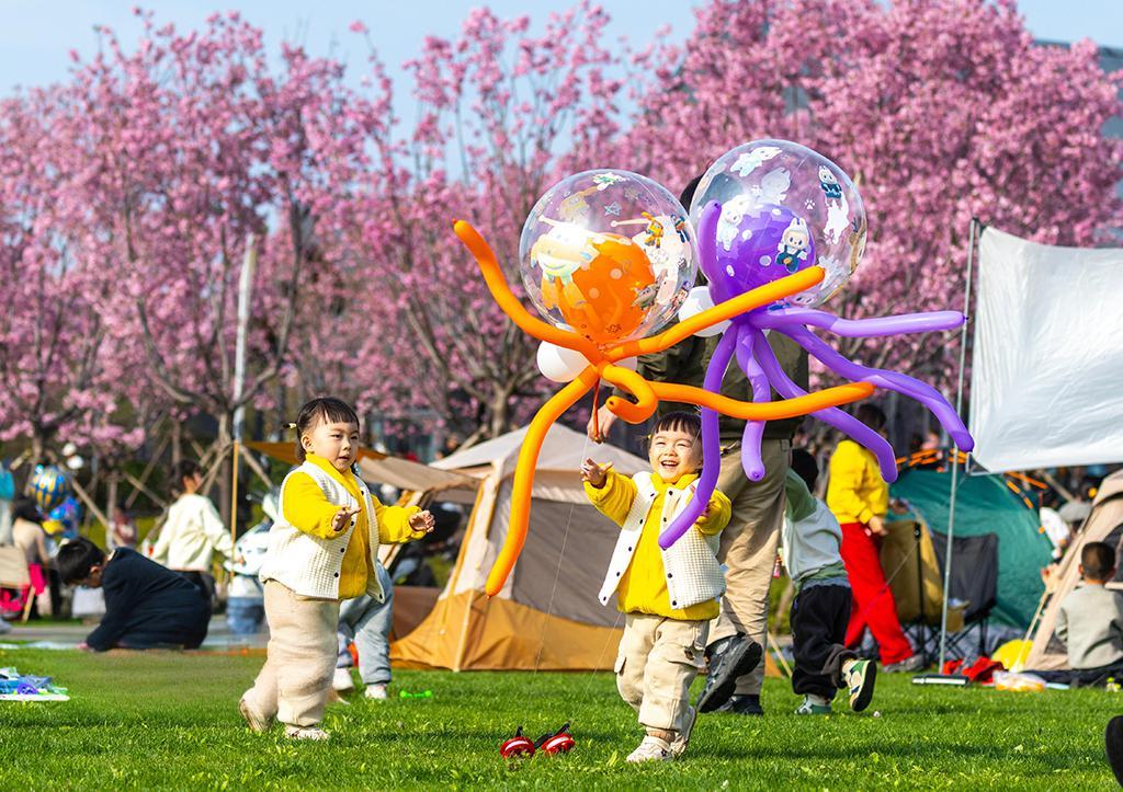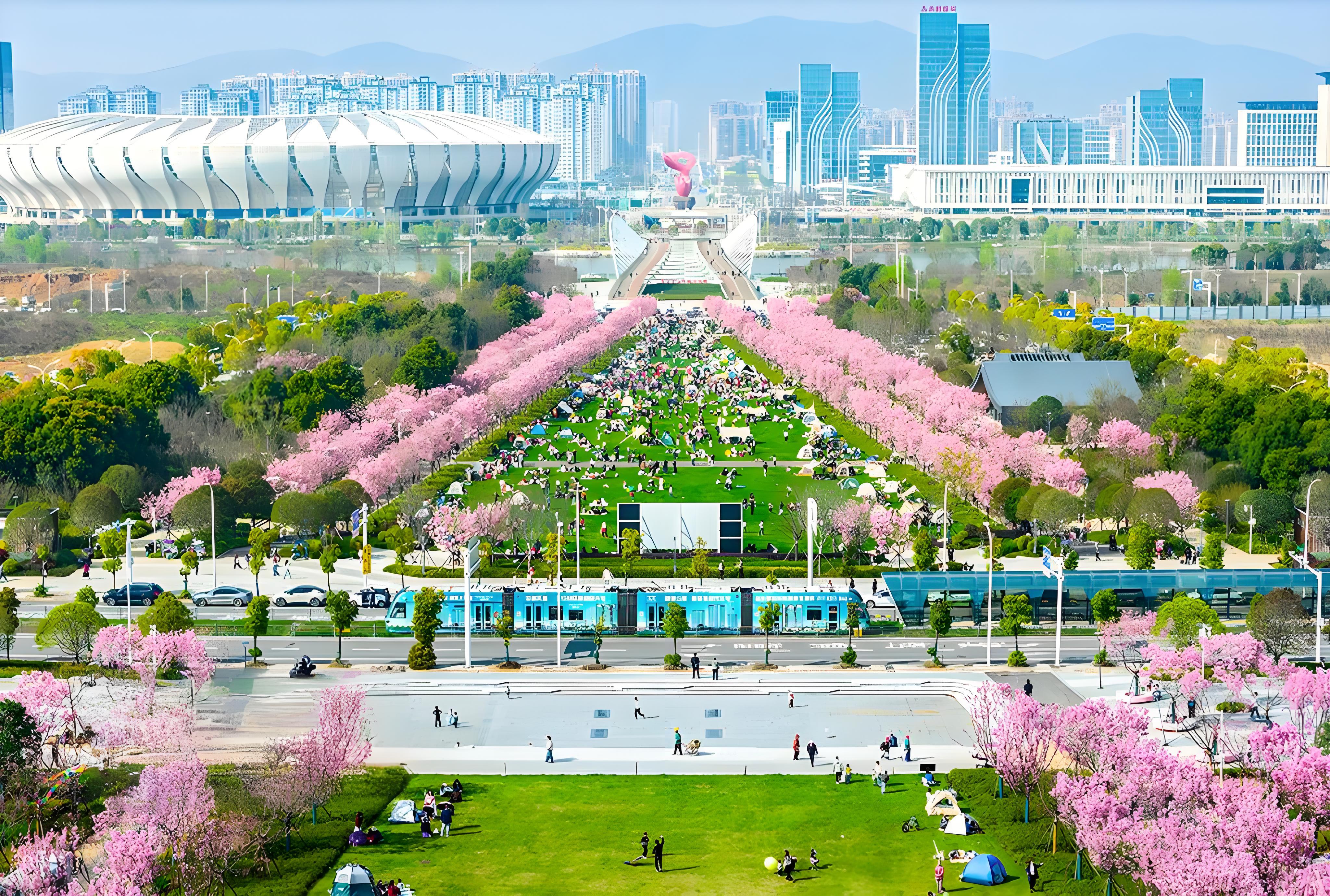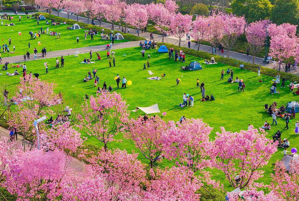 2026년 3월 22일, 호북 황석(黄石)의 올림픽체육공원에서 시민들이 휴식을 취하며 아름다운 봄날을 즐기고 있다.