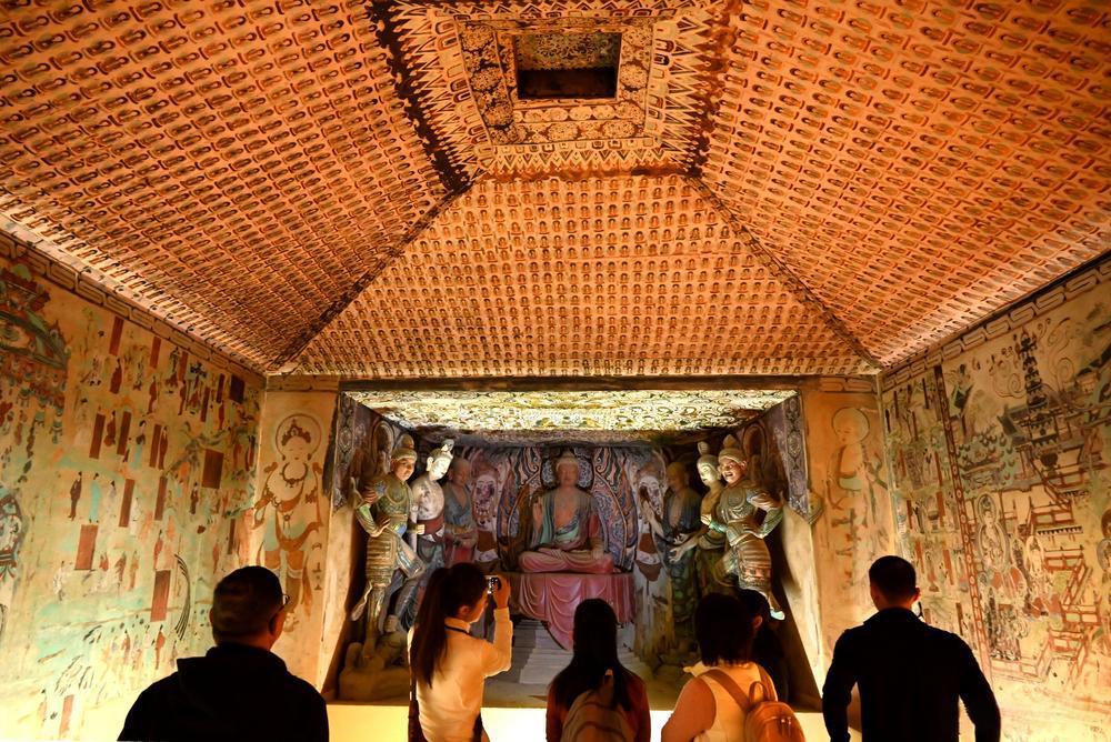 6일 감숙성 돈황시 박물관에서 문물전을 참관하는 관광객들.