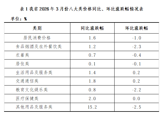 2026년 3월 흑룡강성 8대 부문 가격의전년·전월 대비 상하락률 현황표