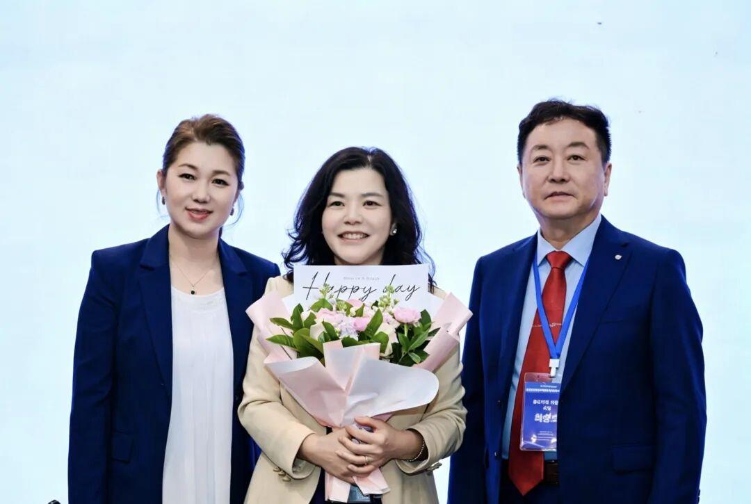 곤명에서 중국경제인들을 위한 강연을 성공적으로 마치고 생화를 받고 있는 정경자(가운데) 박사.