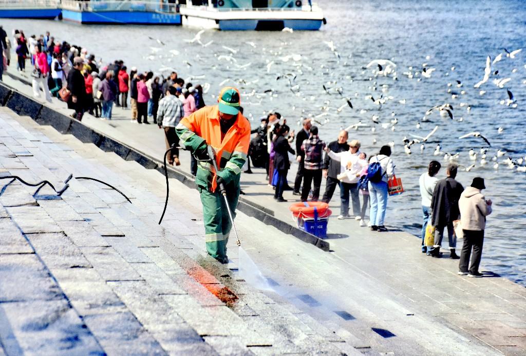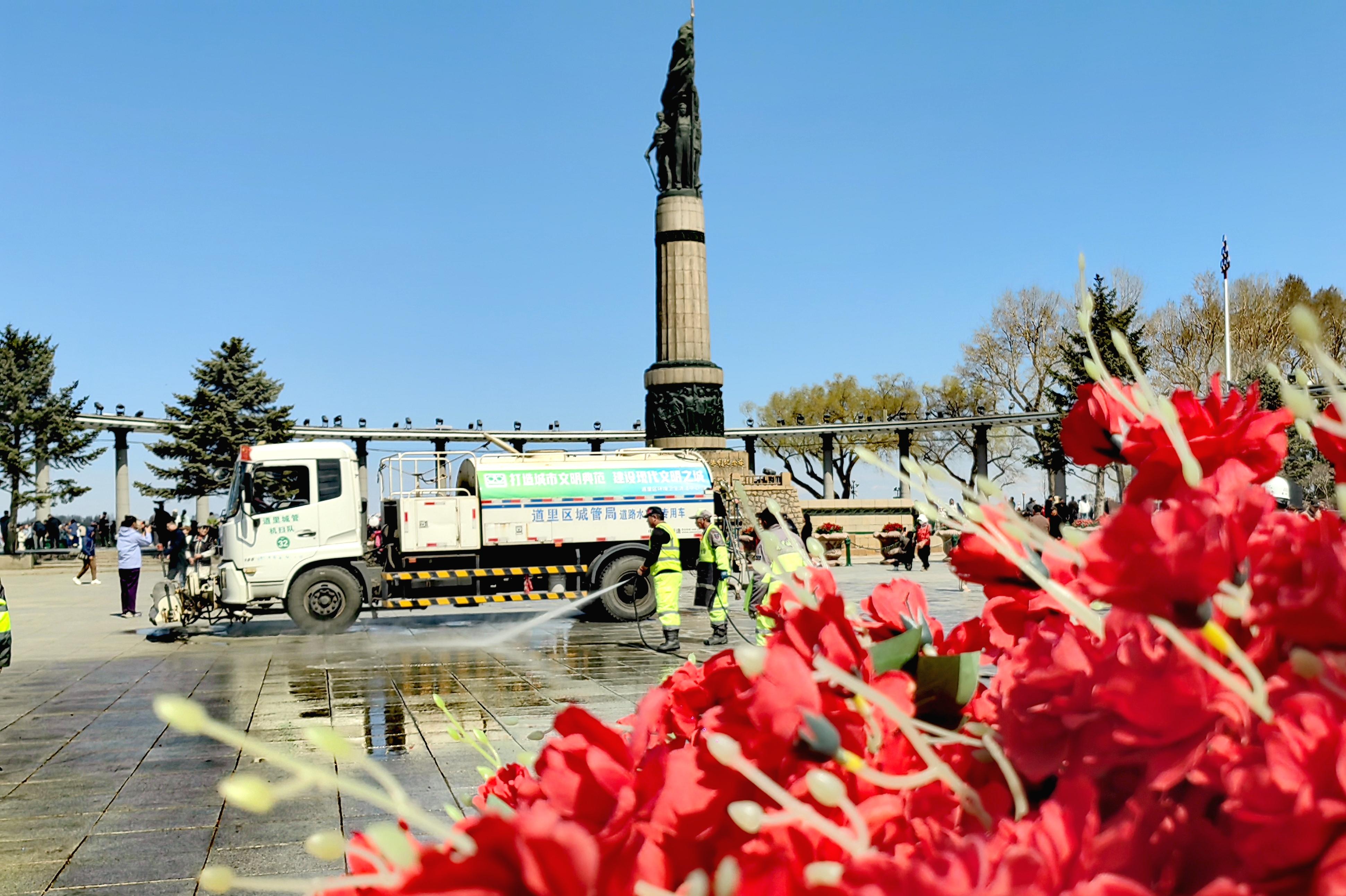 할빈시 도리구 강변 홍수방지기념탑 근처에서 직원들이 광장 바닥을 씻어내거나 강변 계단을 청소하는 모습이 보였다. 청소가 끝난 후 주변 환경은 새롭게 단장되였다.