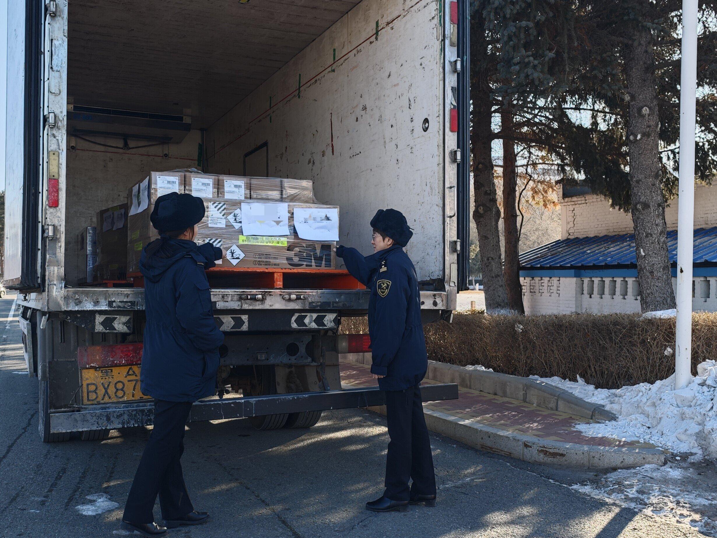 할빈세관 직원이 자유무역구 할빈구역의 수출 화물을 검사하고 있다.